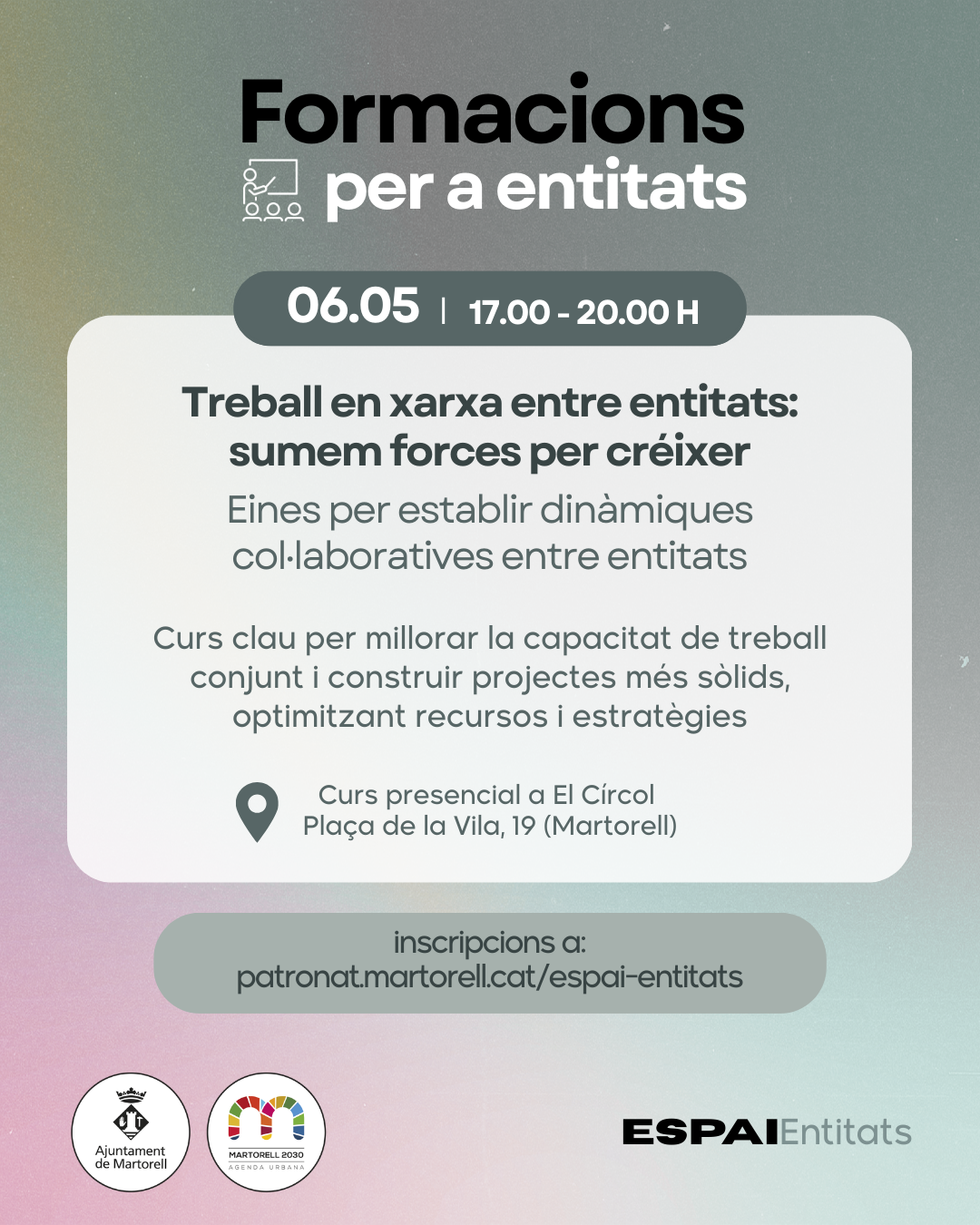 Treball en xarxa entre entitats: sumem forces per créixer’. La jornada pretén que les entitats multipliquin el seu impacte sumant esforços amb altres, enfortir la col·laboració entre elles, impulsar dinàmiques de treball compartides i crear projectes de valor comunitari, entre d’altres. Els formadors de l’Escola EFA volen plasmar amb aquest curs que quan les entitats cooperen, els projectes creixen, els recursos s’optimitzen i les solucions són més eficaces.