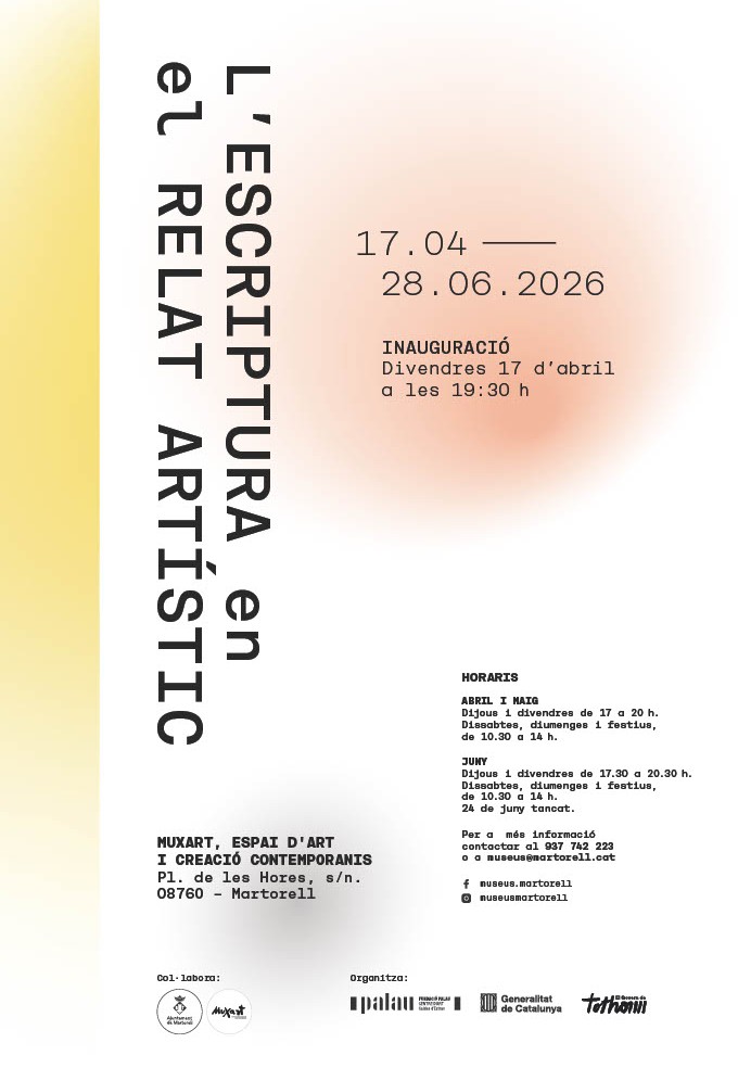 Una exposició col·lectiva comissariada per Mercè Alsina on hi participen Anna Dot, Marla Jacarilla, Alicia Kopf, Almudena Lobera, Rita Puig-Serra, Irene Solà i Laura Torres Bauzà.“L’escriptura en el relat artístic” és el resultat d’una especulació sobre les interseccions entre l’art i l’escriptura a partir de projectes que generen espais indeterminats, sense pertànyer categòricament ni a una disciplina ni a l’altra.