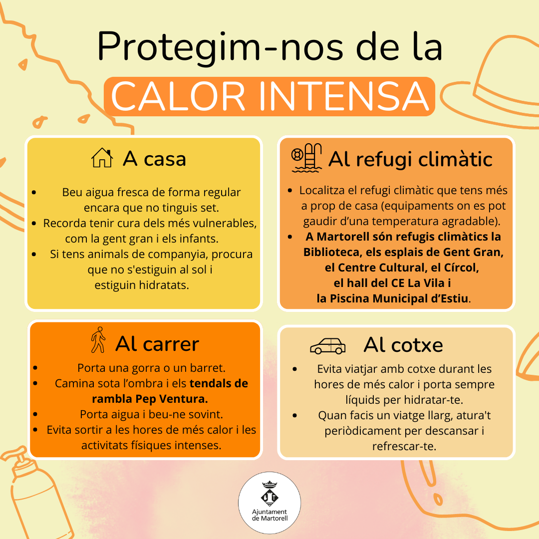 Les persones més vulnerables, com infants, gent gran o persones amb malalties cròniques, han de prestar especial atenció a la hidratació i evitar l’exposició directa al sol. A Martorell, aquells que necessitin refugiar-se de la calor poden acudir als Esplais de Gent Gran de la Vila i de Buenos Aires, al Centre Cultural El Círcol, al vestíbul del Complex Esportiu La Vila o a la Piscina Municipal d’Estiu.