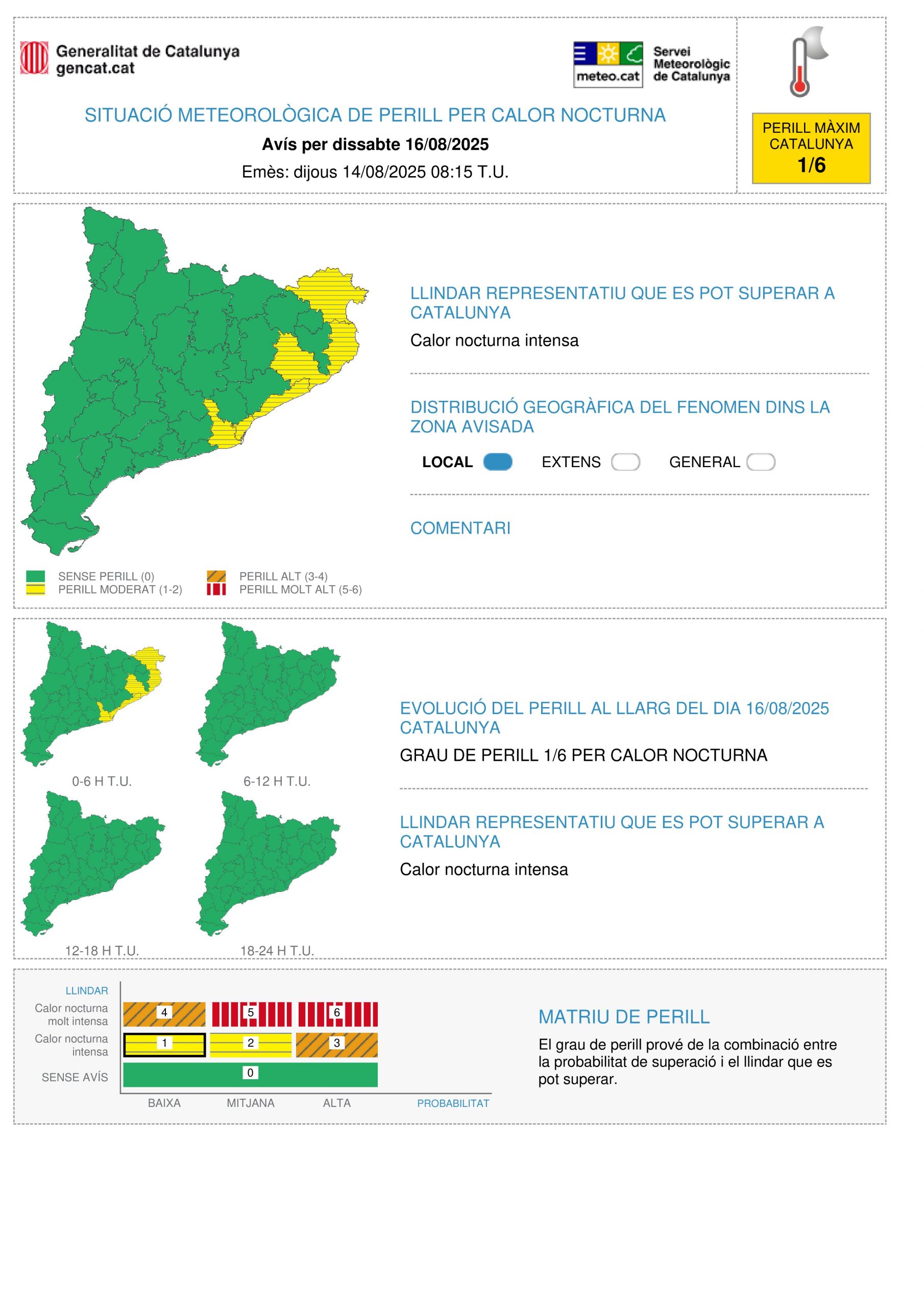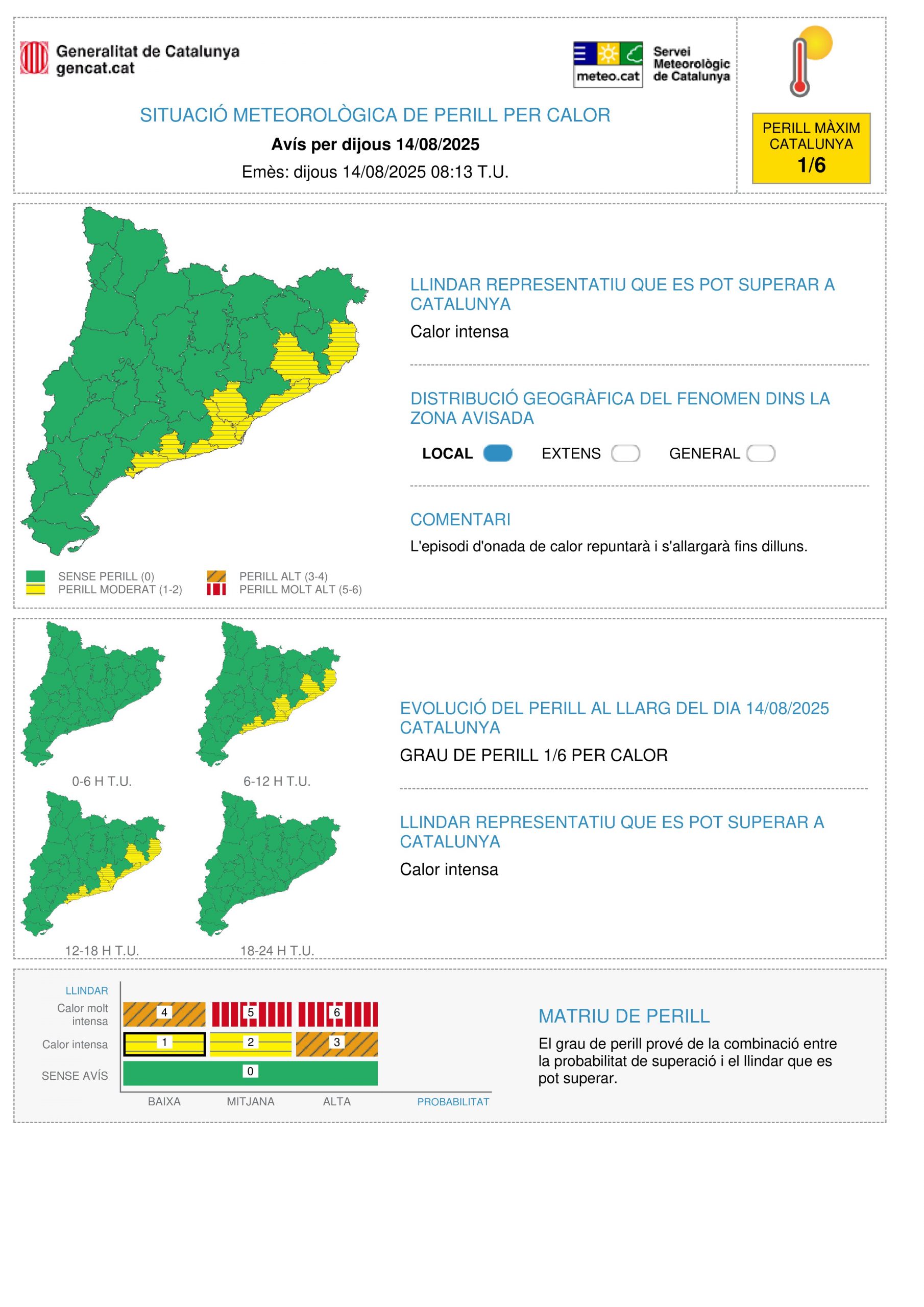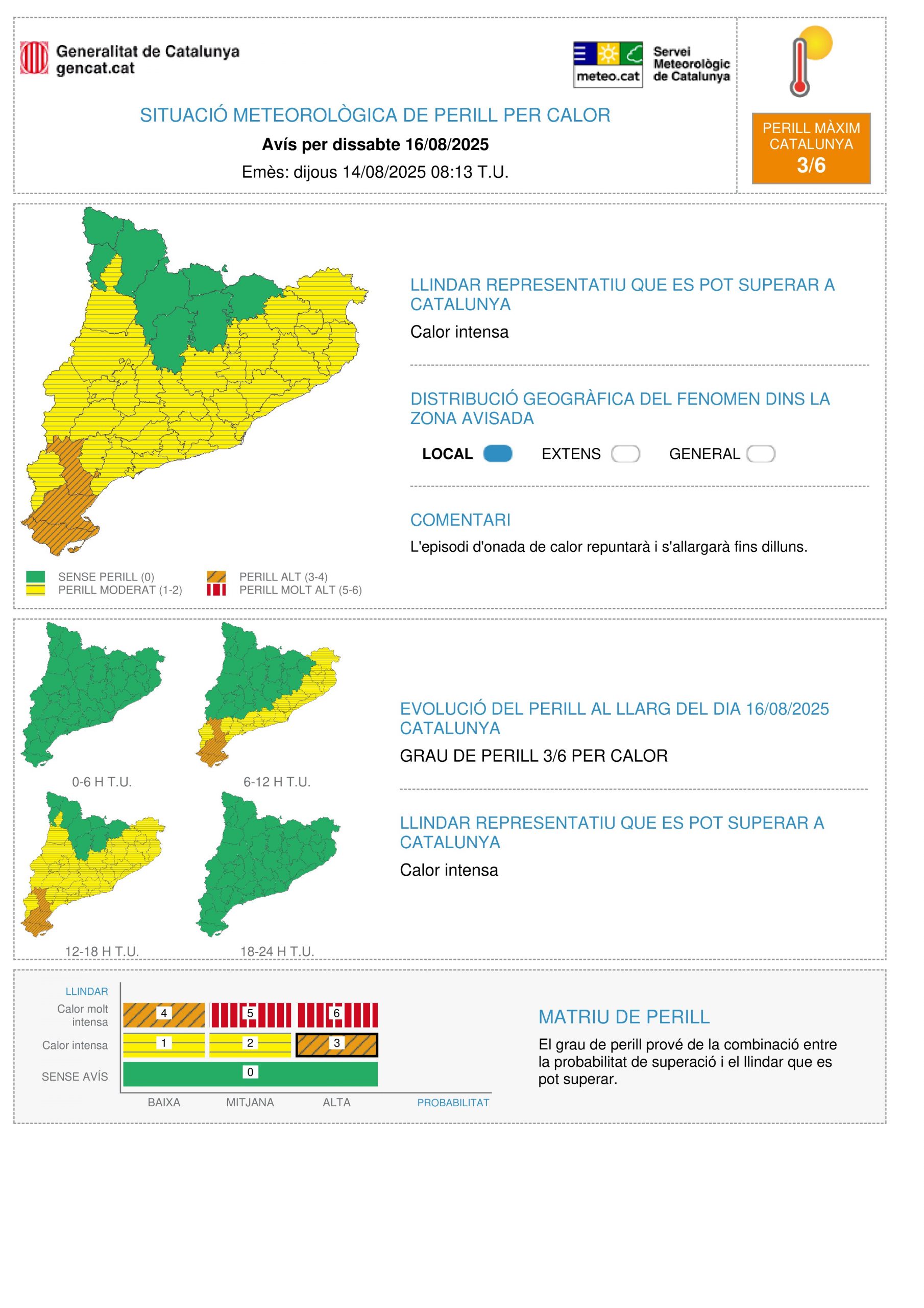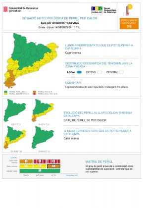 El PROCICAT recomana als ajuntaments habilitar espais frescos amb aire condicionat i extremar la vigilància sobre col·lectius vulnerables. També recorda que l’episodi de calor intensa podria allargar-se fins dilluns 18 d’agost.