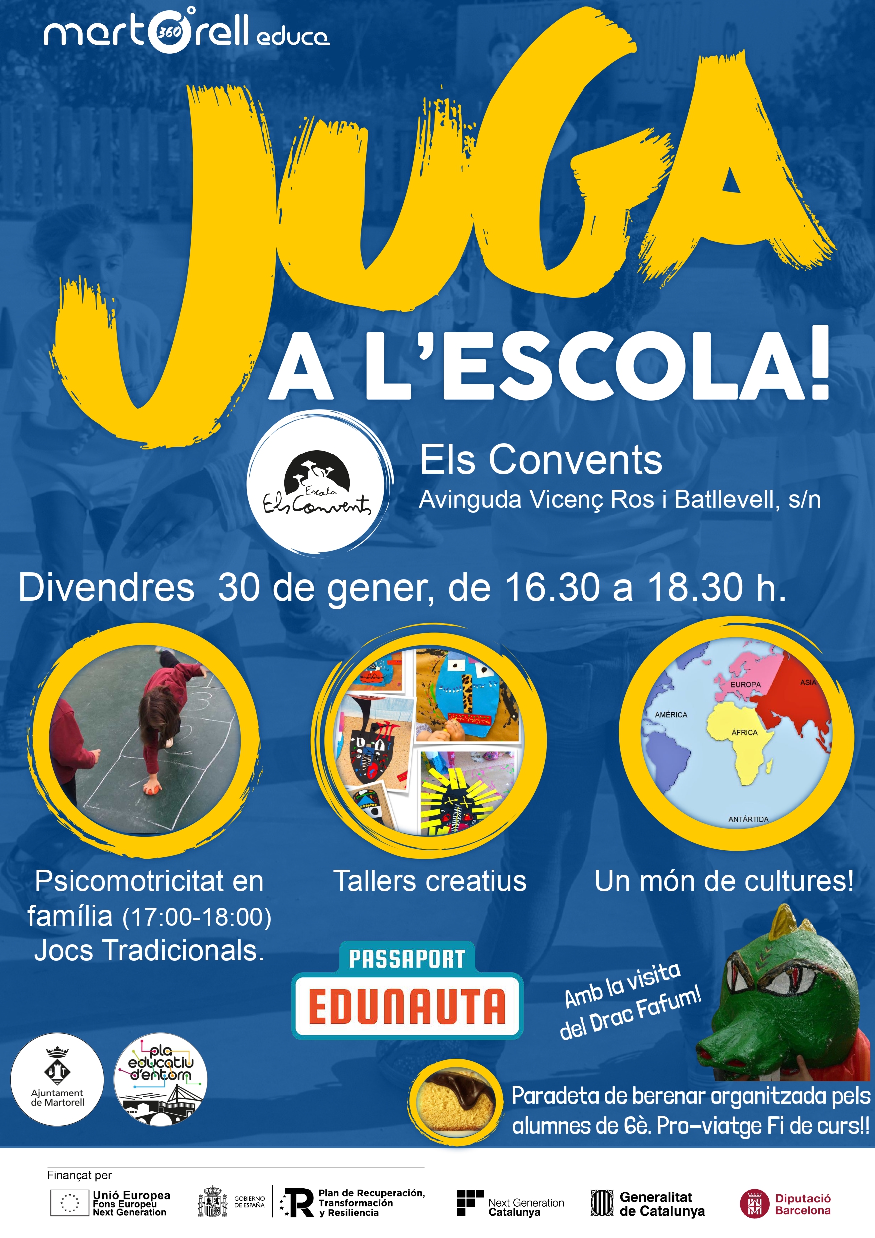 ‘Juga a l’Escola’ és una activitat gratuïta adreçada a totes les famílies amb infants d’educació infantil i primària de Martorell. La proposta convida a gaudir plegats d’una tarda plena d’activitats lúdiques, educatives i inclusives.