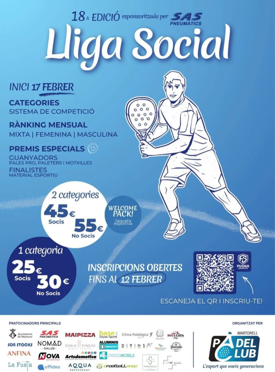 El Martorell Pàdel Club ja ha posat en marxa la 18a edició de la seva Lliga Social, una de les competicions més consolidades del calendari esportiu local. Les inscripcions estan obertes fins al 12 de febrer i la lliga començarà el dia 17 del mateix mes. Com és habitual, les places són limitades i hi haurà tres categories: masculina, femenina i mixta.