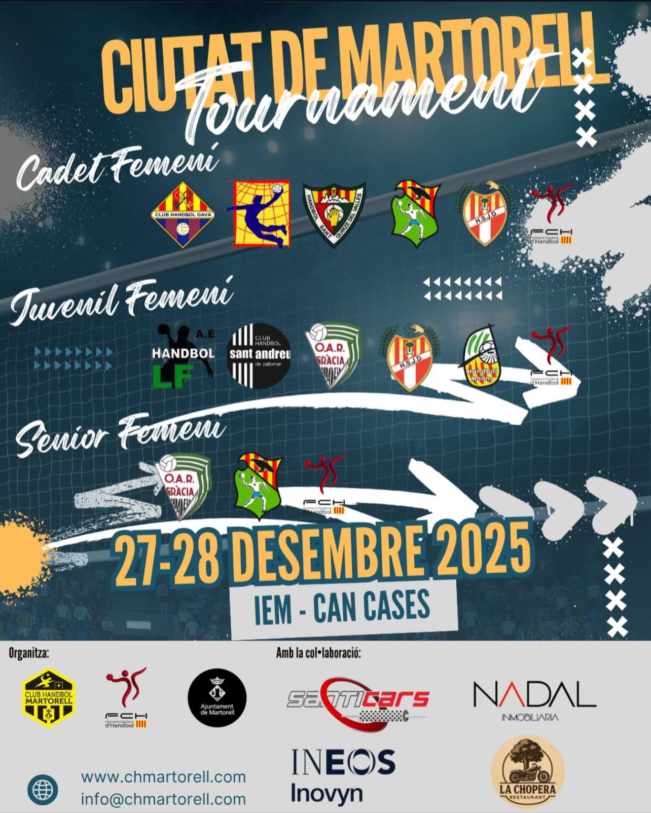 L’handbol femení serà protagonista a Martorell els dies 27 i 28 de desembre amb la celebració del 1r Torneig Ciutat de Martorell, una nova cita esportiva que reunirà clubs i seleccions catalanes i convertirà el municipi en un punt de trobada del talent emergent de l’handbol femení. El torneig es disputarà al Pavelló de Can Cases i a les Instal·lacions Esportives Municipals (IEM), i està organitzat pel Club Handbol Martorell, amb la col·laboració de la Federació Catalana d’Handbol i l’Ajuntament de Martorell.