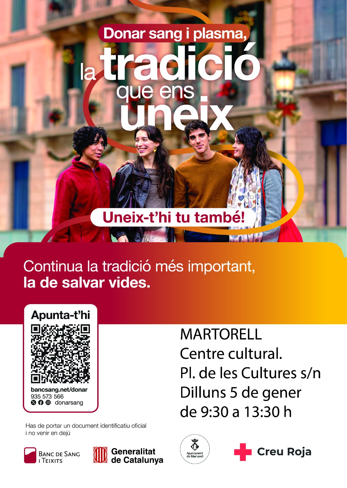 Coincidint amb les festes nadalenques, una època marcada pels bons propòsits, el Banc de Sang fa una crida a la ciutadania a instaurar la donació de sang com una tradició familiar. La proposta convida a viure aquest gest solidari com una experiència compartida, acompanyats de germans, fills, tiets, amistats, companys de feina, colles o equips esportius. A Martorell, el pròxim dilluns 5 de gener, de 9.30 a 13.30h, tindrà lloc una jornada de donació de sang i de plasma al Centre Cultural.