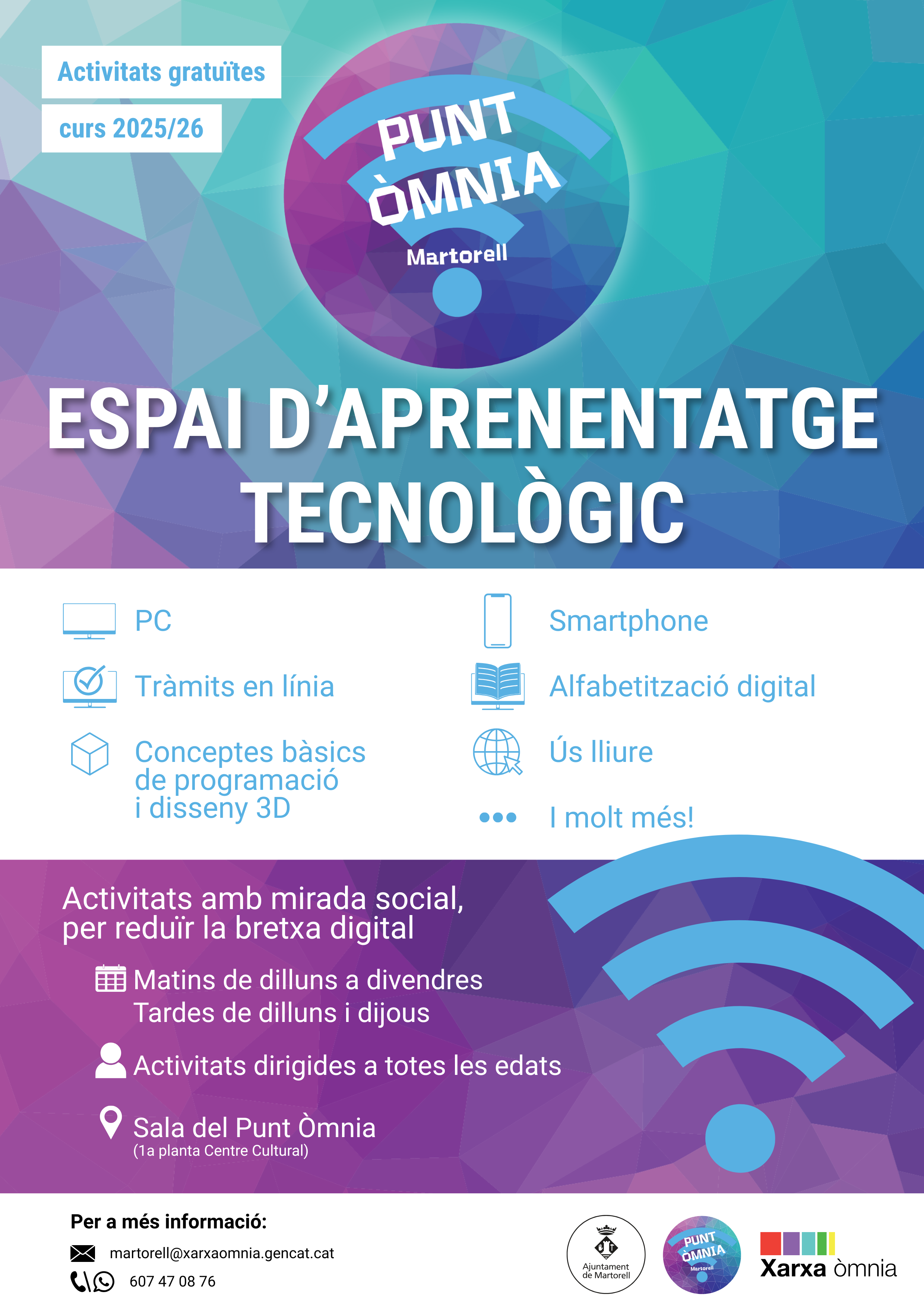 El Punt Òmnia és un recurs comunitari d’aprenentatge de les noves tècnologies i de realització de tràmits en línia. Forma part de la Xarxa Òmnia, que va néixer l’any 1999, i a Martorell es va implantar el 2001, convertint-se en un referent local en inclusió digital. Així dos, el servei commemora aquest 2026 el seu 25è aniversari. Al llarg de l’any és previst organitzar diverses activitats commemoratives, inclòs un projecte d’exposició amb la participació de grups avançats.