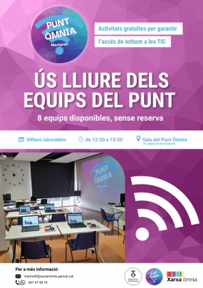 A més, cada dilluns laborable, de 12.30 a 13.30h, la sala del Punt Òmnia posa a disposició vuit ordinadors amb connexió a Internet i programes d’edició, sense necessitat de reserva prèvia. L’accés és per ordre d’arribada.