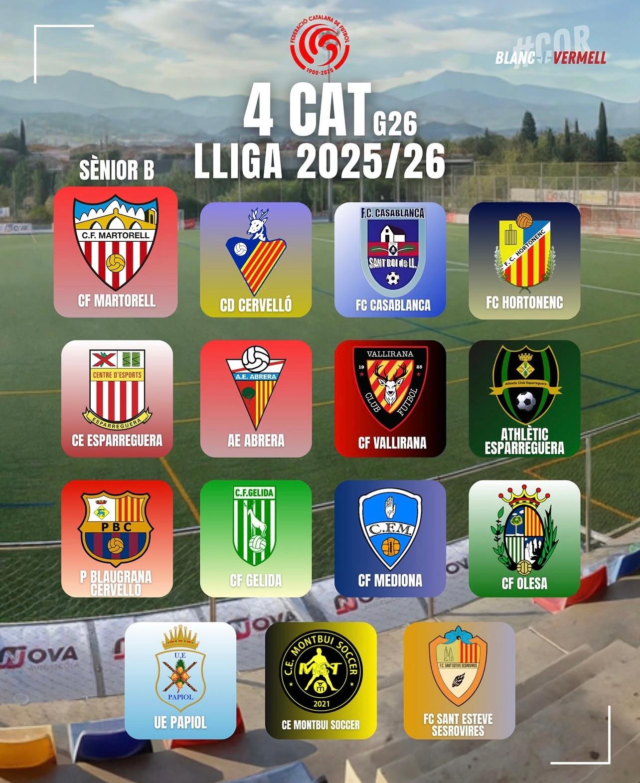 Els rivals del sènior ‘B’ seran: CD Cervelló, FC Casablanca ‘C’, FC Hortonenc ‘B’, CE Esparreguera ‘B’, AE Abrera ‘B’, CF Vallirana, Athletic Club Esparreguera, Penya Blaugrana Cervelló, CF Gelida, CF Mediona, CF Olesa, UE Papiol ‘B’, CE Montbui Soccer i FC Sant Esteve Sesrovires ‘B’.