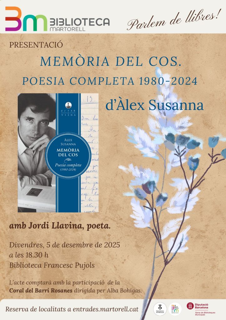 President del Premi Vila de Martorell durant 10 anys i vinculat durant dues dècades al certamen, Àlex Susanna i Nadal ens va deixar el juliol de 2024. El proper divendres 5 de desembre (18.30h), la Biblioteca recordarà la seva creació poètica sencera, a cura de Viena Edicions, titulada Memòria del cos. Poesia completa 1980-2024. Un acte conduït pel també poeta gelidenc Jordi Llavina, “també un dels grans del nostre país”, apunta la tècnica de la Biblioteca, Josefina Canals.