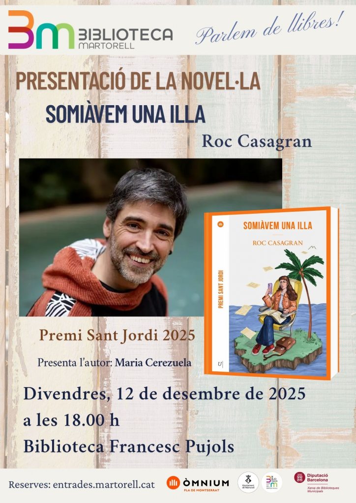 El següent divendres, dia 12 (18.00h), el Premi Sant Jordi 2025 Roc Casagran presentarà Somiàvem una illa. “S’endinsa en la història de la Carla, qui necessita endreçar la seva vida, reconnectar amb el que és important de debò i curar-se les ferides. Per aconseguir-ho, haurà de viatjar molt endins de si mateixa, i molt enfora, també, a un munt d’illes que l’ajudaran a veure la vida des d’una altra òptica”, apunta Canals. Presentarà l’autor la periodista martorellenca Maria Cerezuela, en un acte organitzat per Òmnium Cultural Pla de Montserrat.