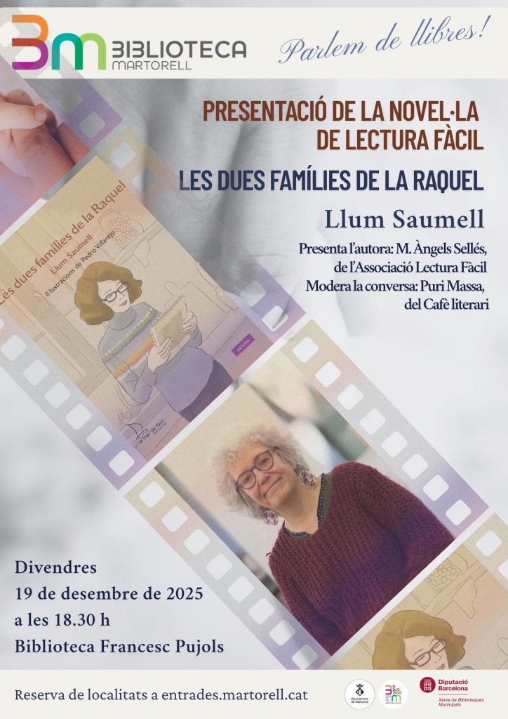 I encara set dies després, el 19 (18.30h), qui portarà un dels seus darrers treballs serà l’escriptora i periodista martorellenca Llum Saumell. Darrerament ha treballat en el gènere de la lectura ràpida, que és molt adequat per a persones amb dificultats lectores. Fruit d’això, fa mesos va publicar Las dos familias de Raquel, ara traduït al català. Maria Àngels Sellés i el grup Cafè Literari presentaran l’autora.