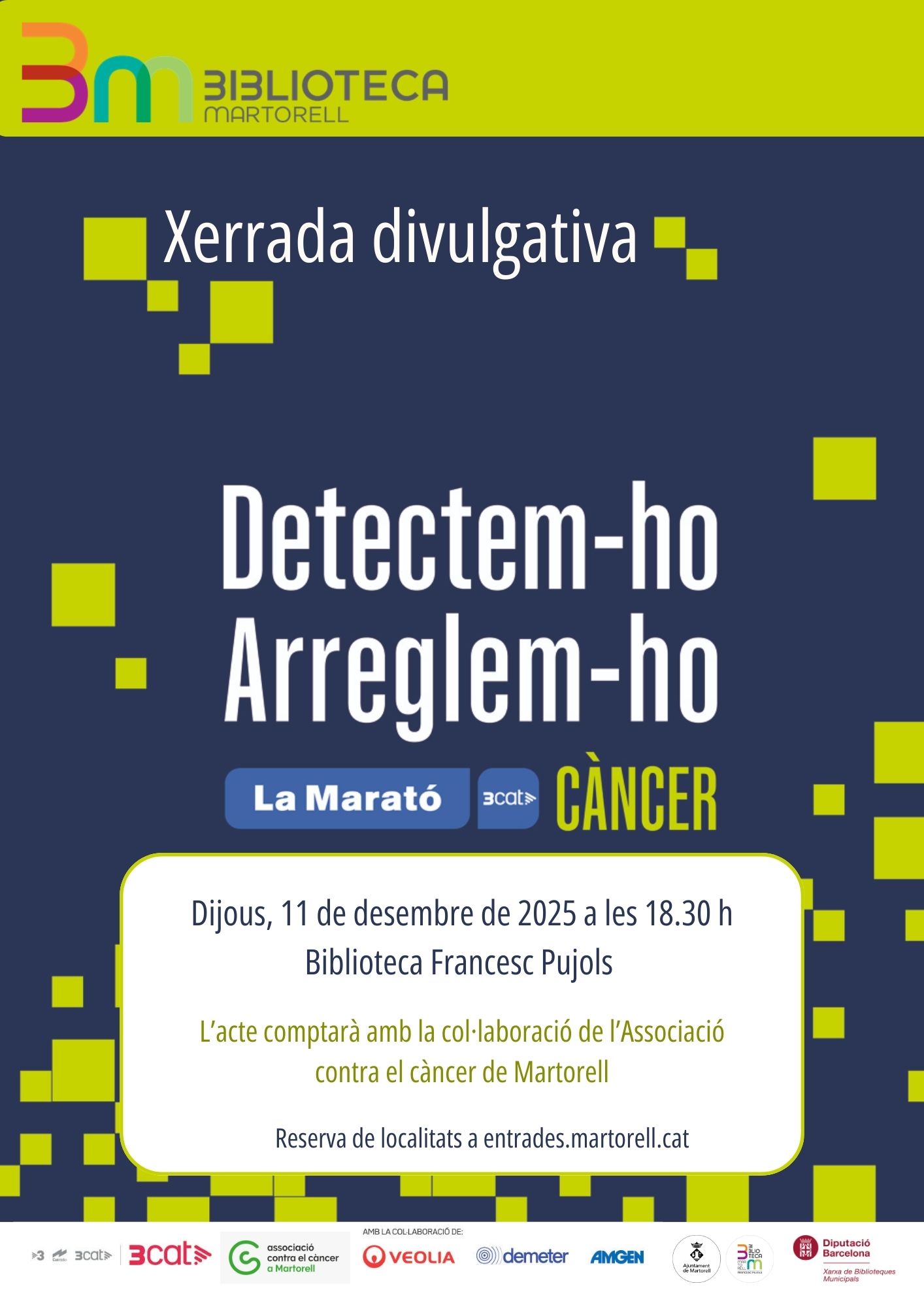 Pel que fa a la resta de propostes del mes, aquestes comencen el dijous 11 (18.30h) amb la xerrada divulgativa ‘El càncer’, organitzada per La Mataró de TV3, i on es pretén conscienciar sobre tot allò que està a l’abast de la ciutadania per prevenir-la i detectar-la a temps ja que és una de les principals causes de mort a Catalunya i a tot el món. L’acte comptarà amb la col·laboració de l’Associació contra el càncer de Martorell.
