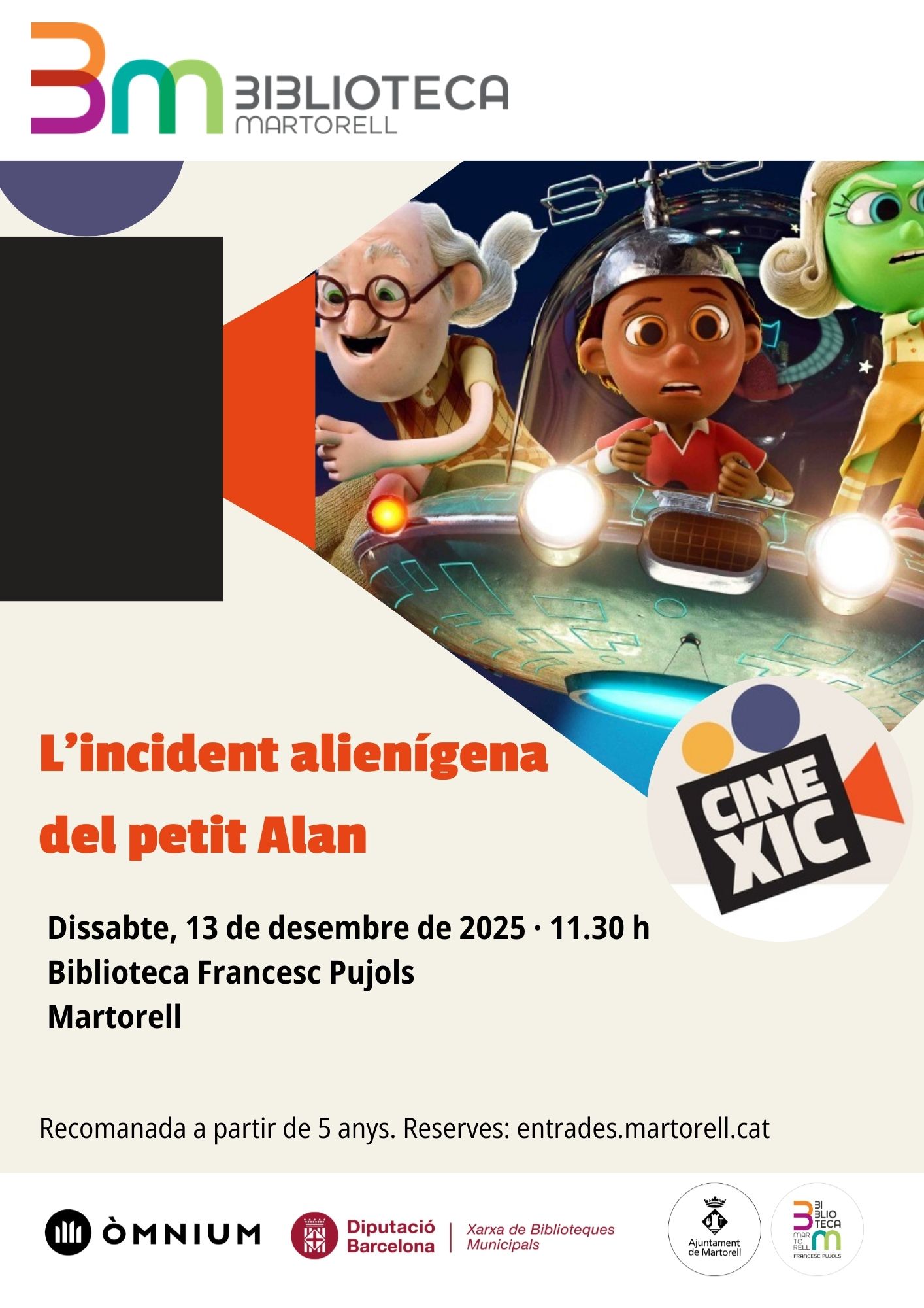El dissabte 13, (11.30h) arriba la sessió mensual del Cinexic, amb la projecció de L’incident alienígena del petit Alan, la història d’un nen que se’n va a viure a una altra ciutat i coneix un nou veí, en Walter, qui està fascinat pels ovnis. És un film recomanat a partir de 5 anys.