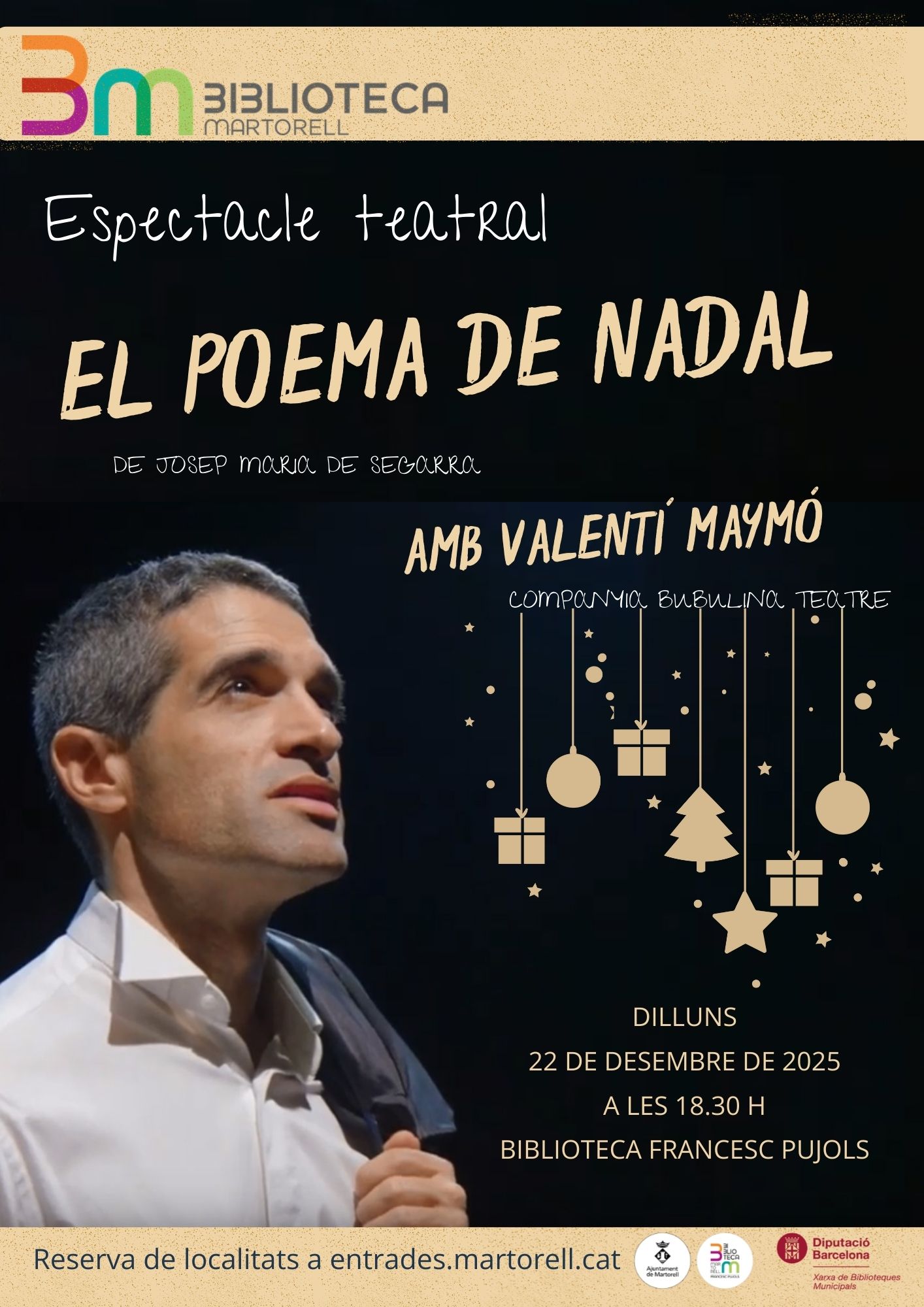 I a les portes de Nadal, l’actor Valentí Maymó i la Companyia Bubulina Teatre porten –dia 22 de desembre, 18.30h- l’espectacle teatral El poema de Nadal, de Josep Maria de Sagarra. “Una versió actualitzada amb un actor extraordinari, a partir de l’imaginari de l’obra ‘Vida privada’ del mateix autor, es fa una relectura del poema clàssic català, per fer-nos transitar cap al Nadal amb l’acompanyament de la música de la tenora i l’acordió”.