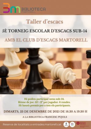 Finalment, el dimarts 23 –de 16.30 a 19.30h- se celebrarà el 5è Torneig Escolar d’Escacs sub-14, amb el Club d’Escacs Martorell, on hi poden participar nens sub-14 i hi haurà premis per a tots els participants.