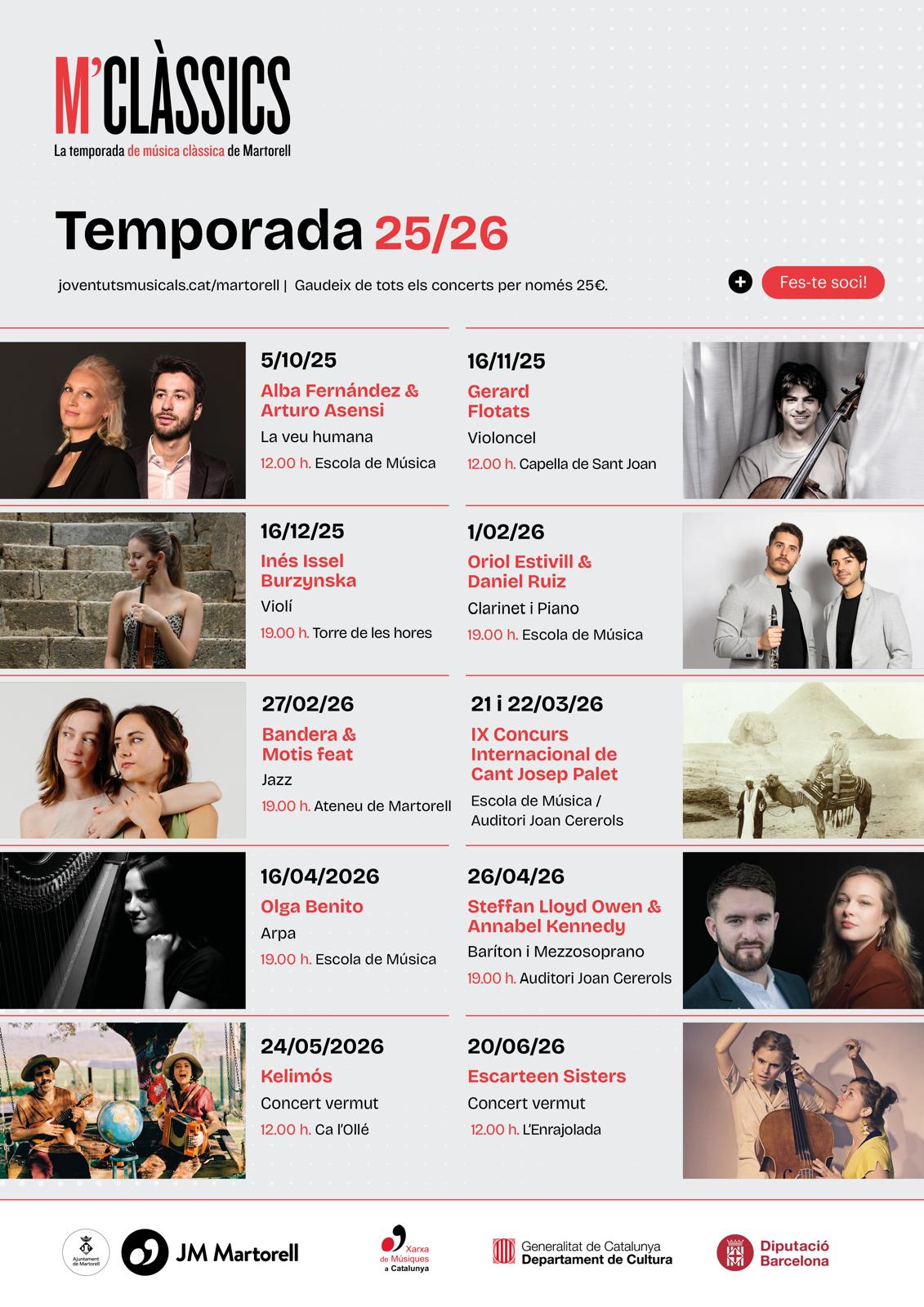 Joventuts Musicals de Martorell, amb el suport de la Regidoria de Cultura, ha iniciat una nova temporada del cicle de concerts ‘M’Clàssics’. Ho va fer el 5 d’octubre passat a Cal Nicolau, dins la Festa del Roser, amb l’actuació del duet musical Arrel & Jazz. La programació d’enguany inclou una desena d’actuacions, de periodicitat mensual, amb personalitats emergents de la música clàssica.