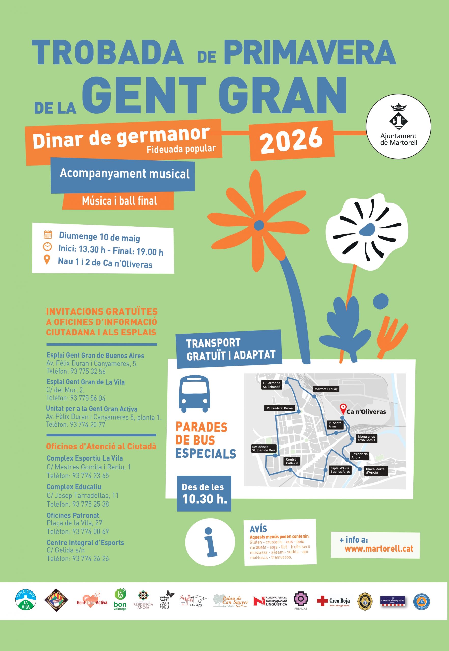 Des d’aquest dilluns ja són disponibles les entrades gratuïtes per a la Trobada de Primavera de la Gent Gran, organitzada per l’Ajuntament de Martorell, que tindrà lloc el diumenge 10 de maig, de 13.30 a 19.00h. La jornada inclourà un dinar de germanor, parlaments institucionals, reconeixements, espectacle i ball, en un ambient festiu i de convivència.