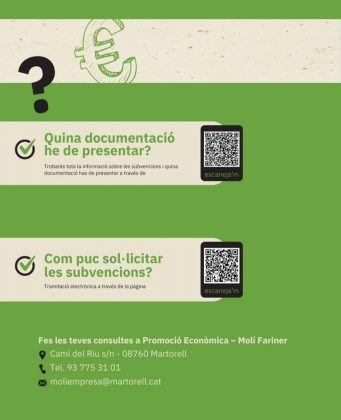 L’Ajuntament de Martorell ha obert la convocatòria de subvencions per al foment de l’activitat econòmica al municipi, amb el cofinançament de la Diputació de Barcelona. Emprenedors, autònoms i empreses amb domicili social o centre de treball a Martorell ja poden presentar la seva sol·licitud per accedir als diferents ajuts destinats a la creació d’ocupació, la formació, la millora de negocis, l’accessibilitat universal i la promoció del comerç i la gastronomia local.
