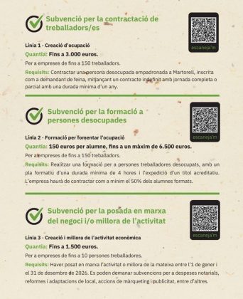 “Disposem de subvencions per a la contractació de treballadors de Martorell per part d’empreses del municipi, per a la formació de persones desocupades, per a la posada en marxa d’un negoci o la millora d’activitats ja existents. Parlem, per exemple, de millores en els establiments, com ara rètols, terrasses, accessos o altres actuacions que ajudin a fer el negoci més rendible”, ha detallat.