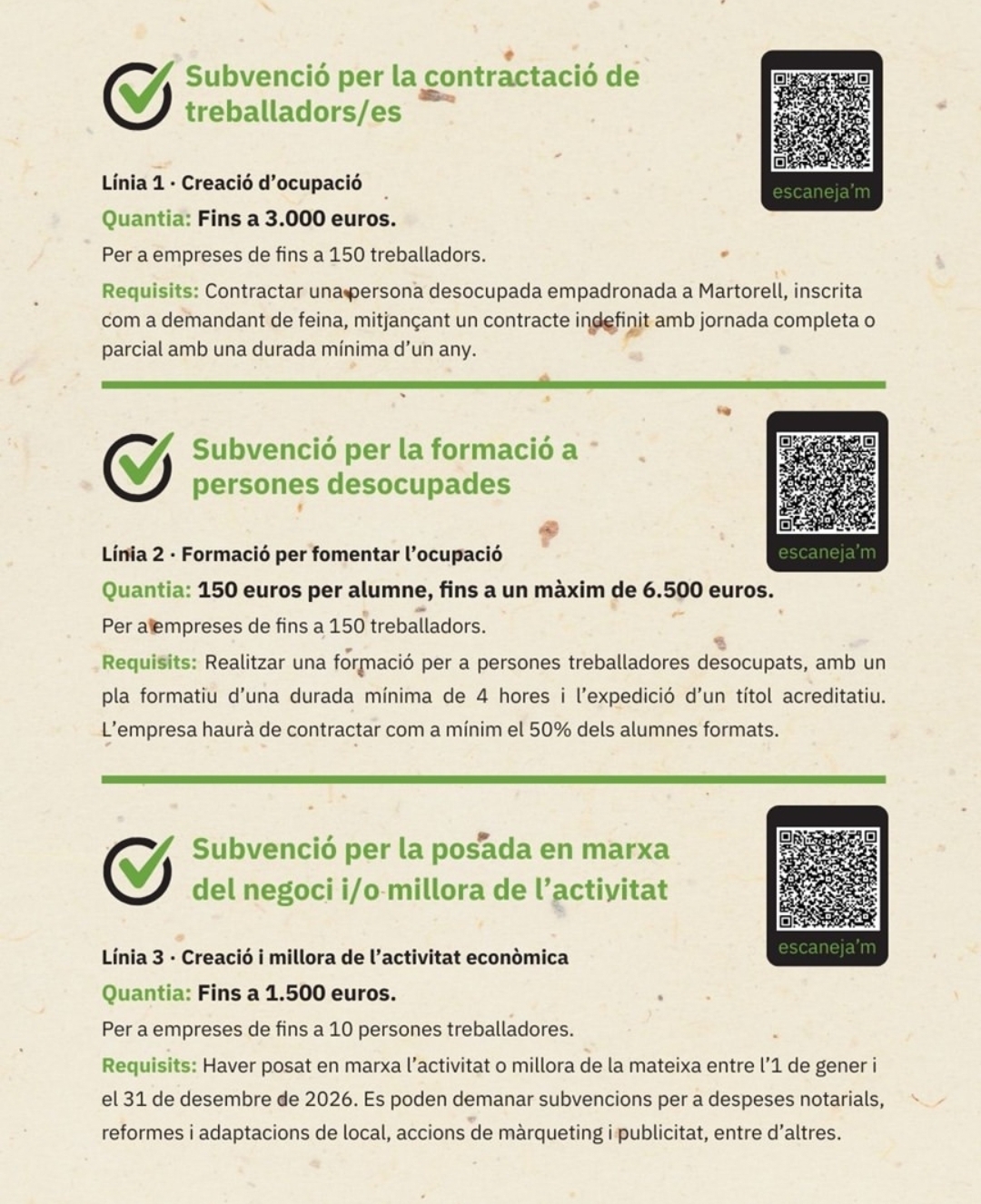 La línia 3 de Creació i/o millora de l’activitat econòmica atorga 1.500 euros per a autònoms i empreses amb una plantilla no superior a 10 persones amb domicili social, delegació o centre de treball a Martorell que hagin posat en marxa o millorat la seva activitat entre l’1 de gener i el 31 de desembre de 2026. Són subvencionables, entre altres, despeses notarials, reformes i adaptacions de local, accions de màrqueting i publicitat.