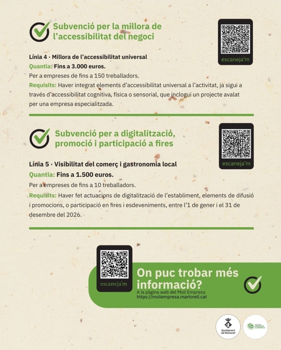 La línia 4 de Millora de l’accessibilitat universal beneficiarà amb 3.000 euros autònoms i empreses amb plantilla no superior a 150 persones amb domicili social, delegació o centre de treball a Martorell. Cal haver integrat elements d’accessibilitat cognitiva, física o sensorial, amb un projecte avalat per una empresa especialitzada.