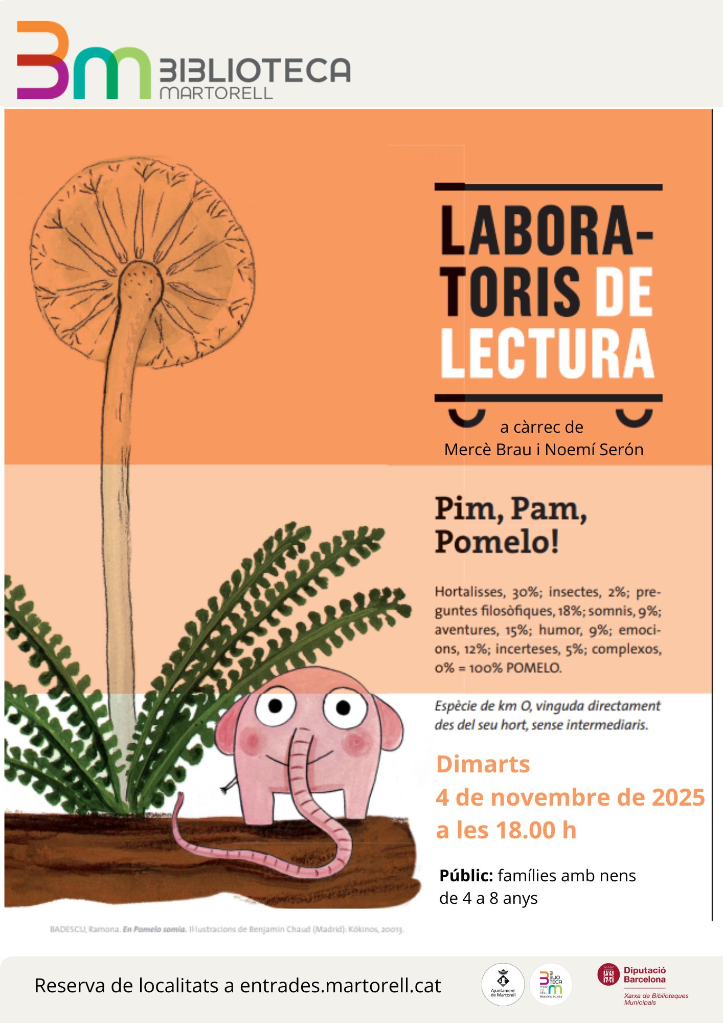 Ja al novembre, Mercè Brau i Noemí Serón tornen a portar el Laboratori de lectura ‘Pim, pam, Pomelo!’, un espai de creació per a les famílies per tal d’experimentar al voltant de la lectura i gaudir de l’essència dels llibres infantils des del vessant creatiu. Una experiència per a infants de 4 a 9 anys.