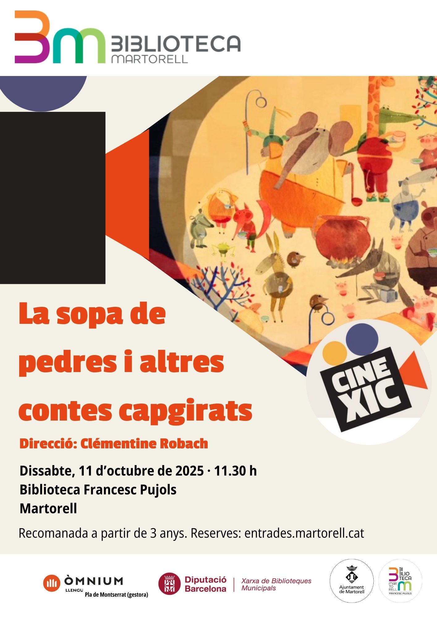 La programació a la Biblioteca es complementa, com és habitual, amb actes dedicats al públic infantil. Per exemple, el CineXic del dissabte 11 (11.30h) amb “La sopa de pedres i altres contes capgirats”, dirigida per Clémentine Robach i encarada a infants a partir de 3 anys.