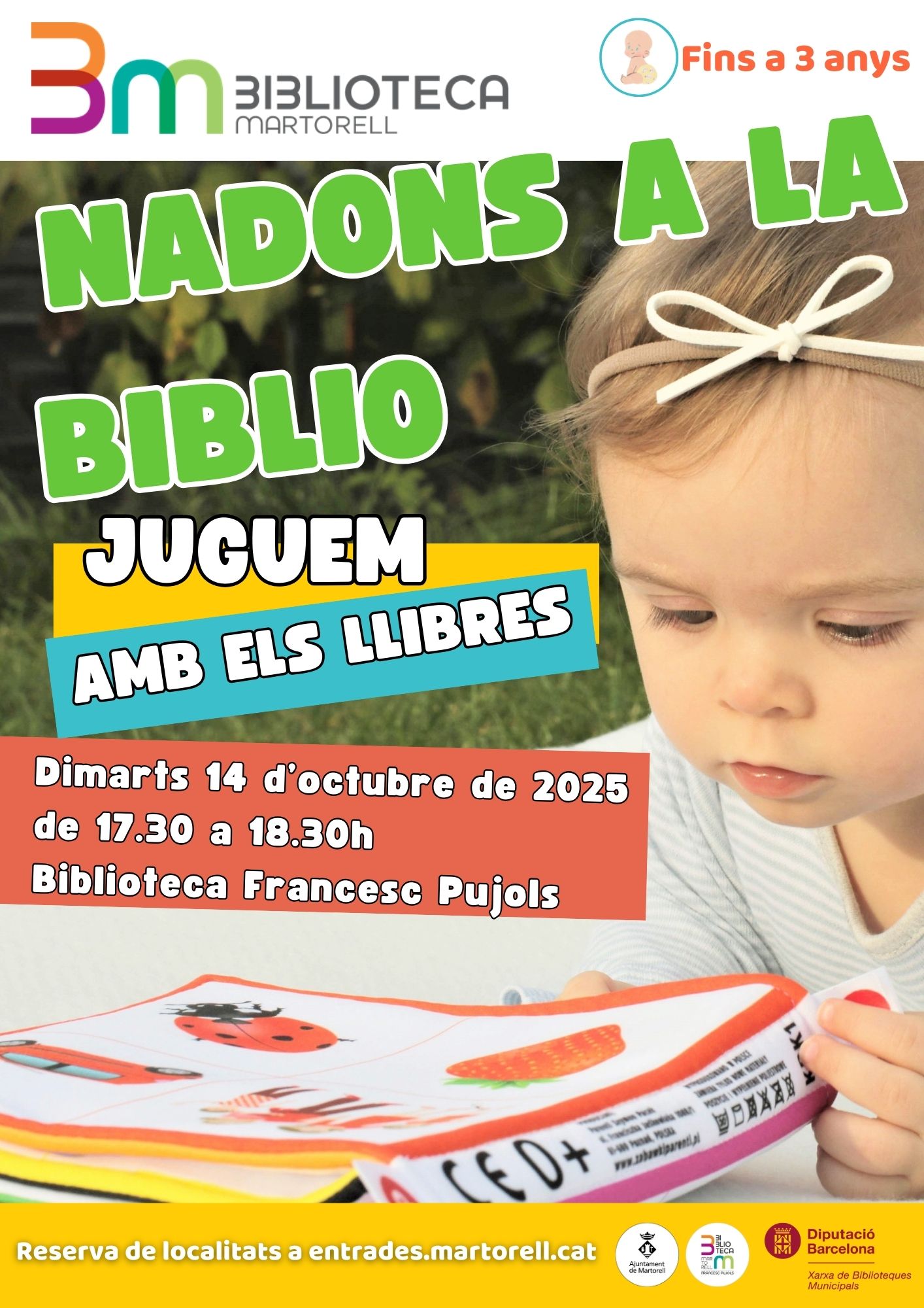 El Nadons a la Biblio del dimarts 14 (de 17.30 a 18.30h) parlarà del ‘Juguem amb llibres’, activitat de joc lliure familiar per a que els pares i els seus fills de fins a 3 anys experimentin amb materials literaris, sensorials, visuals i comparteixin una estona tranquil·la i relaxada.