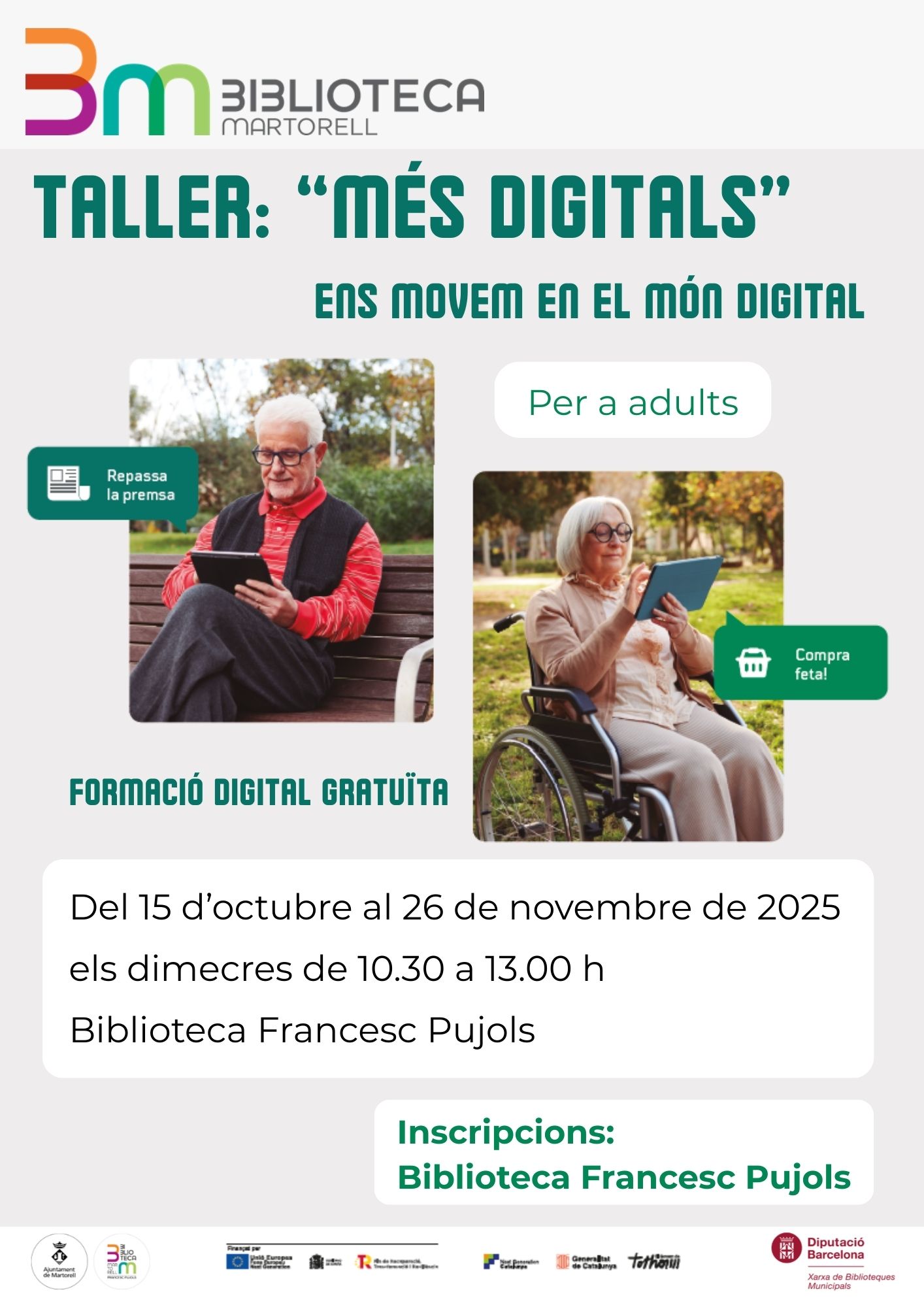 L’equipament ha projectat el taller ‘Més digitals. Ens movem en el món digital’. Set sessions –del 15 d’octubre al 26 de novembre, de 10.30 a 13.00h- per familiaritzar-se amb els correus electrònics, la fotografia digital, la navegació a Internet, les bones maneres a la xarxa i la ciberseguretat.