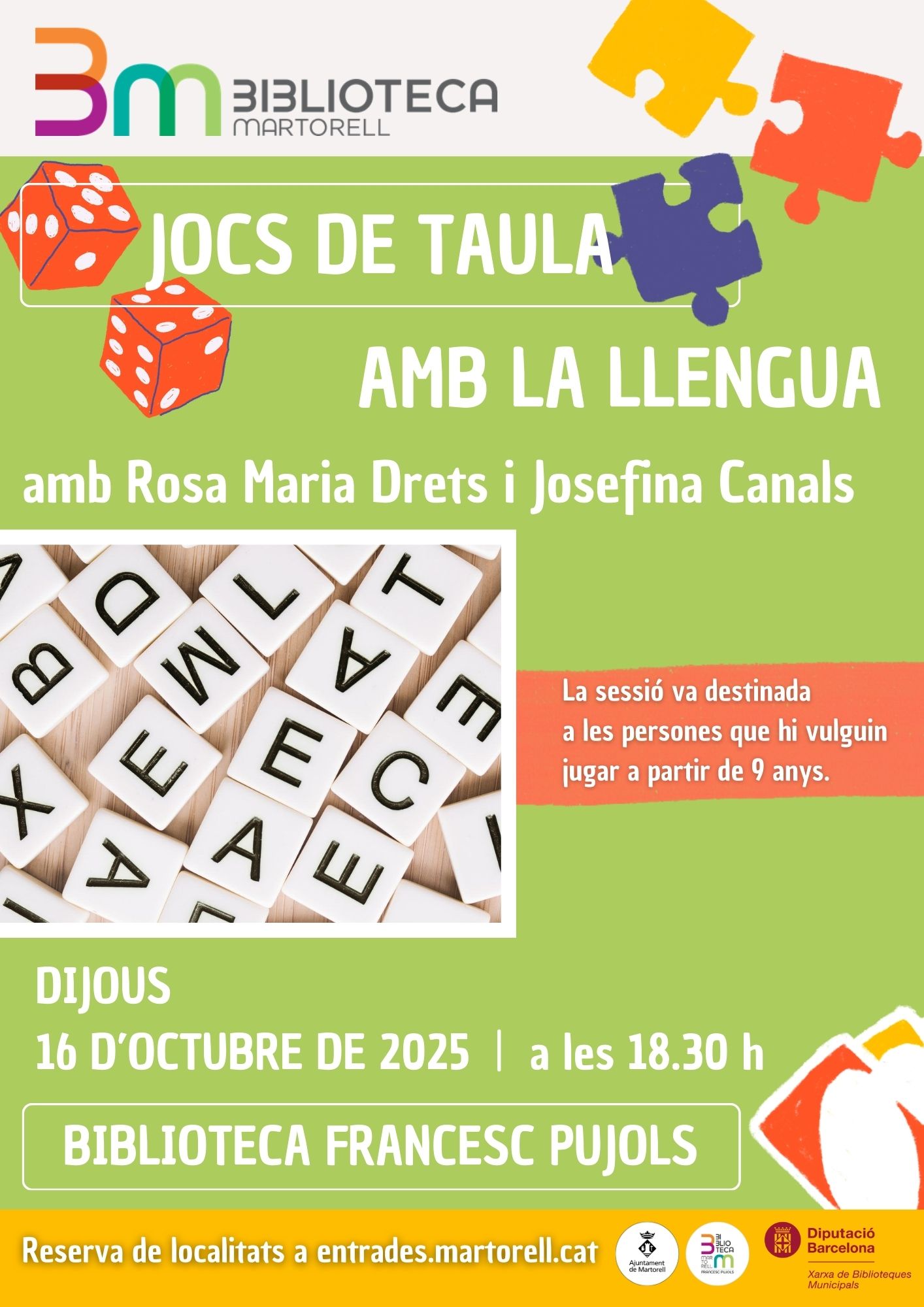 I el dijous 16, a les 18.30h, Jocs de taula amb la llengua, amb Rosa Maria Drets i Josefina Canals, per a infants a partir de 9 anys per treballar habilitats lingüístiques, aprofundir en el coneixement de la llengua i compartir una estona de joc en grup (família o adults).