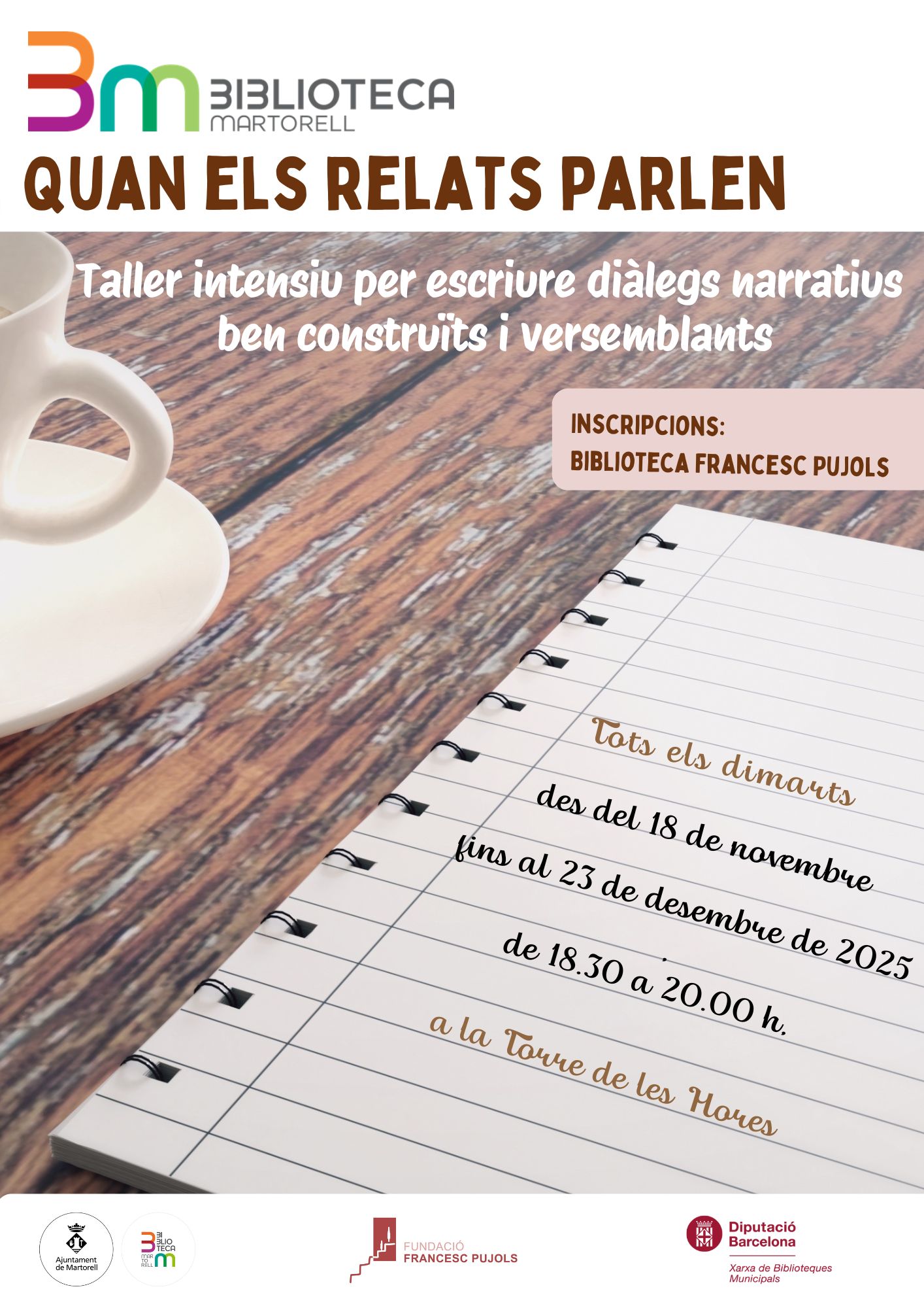 I també el taller d’escriptura de tardor. Trobades de creixement literari per compartir escrits i nous coneixements. La denominació ‘Quan els relats parlen’ inclourà sis sessions de dues hores cadascuna els dimarts de 18.30 a 20.00h del 18 de novembre al 23 de desembre a la Torre de les Hores. Les inscripcions ja es poden fer a la Biblioteca Francesc Pujols.