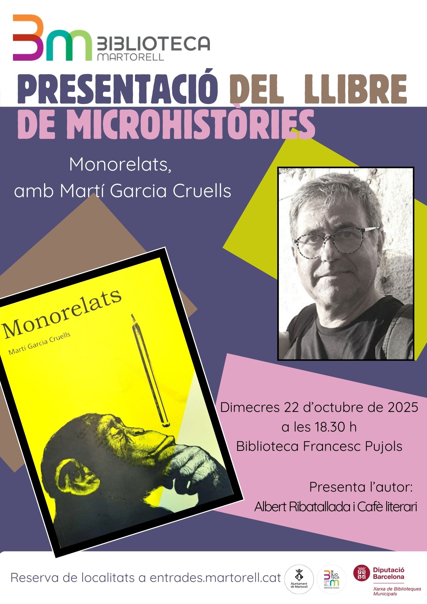 La següent cita és el dimecres 22 (18.30h) amb Monorelats de Martí Garcia Cruells. “L’autor utilitza el llenguatge per a crear micro històries fantasioses aconseguint un recull de textos, enllaçats pel fil d’una imaginació un pèl desenfadada i disruptiva, que ens convida a gaudir de la seva lectura amb un toc d’ironia i humor”. El presentarà Albert Ribatallada i Cafè Literari.
