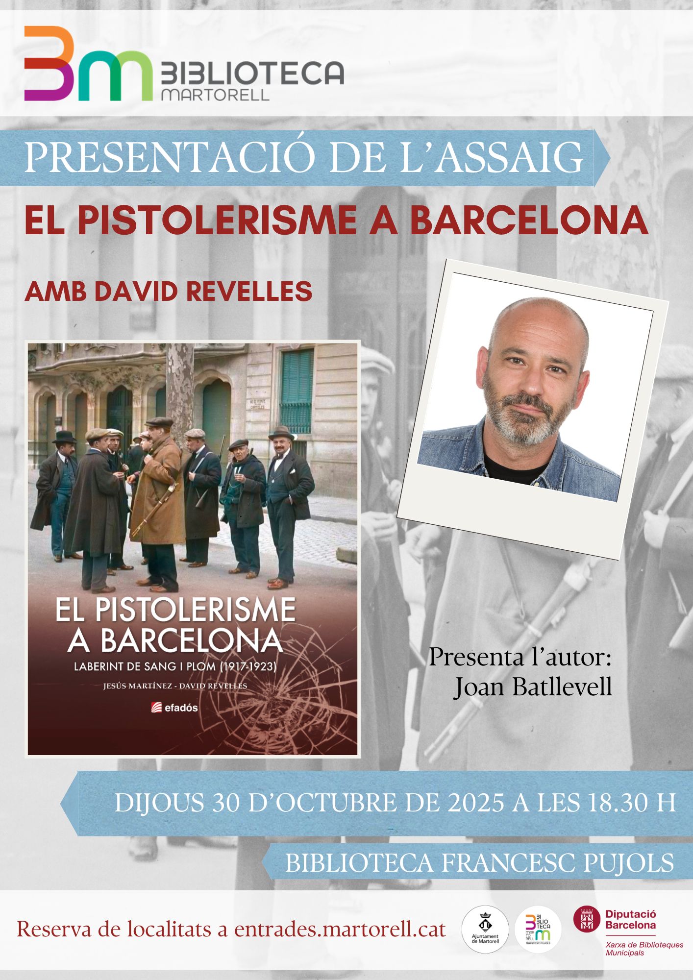 I el dijous 30 (18.30h) el cicle ‘Parlem de llibres!’ presenta l’assaig El pistolerisme a Barcelona, amb David Revelles, periodista, escriptor i autor conjuntament amb Jesús Martínez. El llibre relata “una Barcelona fascinant i implacable on convivia la disbauxa i l’exhibició de riquesa dels cabarets de la Rambla amb la pobresa extrema del Barri Xino i la lluita social de personatges com Salvador Seguí Seguí, el Noi del Sucre, o l’advocat Francesc Layret, un món on les pistoles eren la llei…”. Joan Batllevell presentarà l’autor.