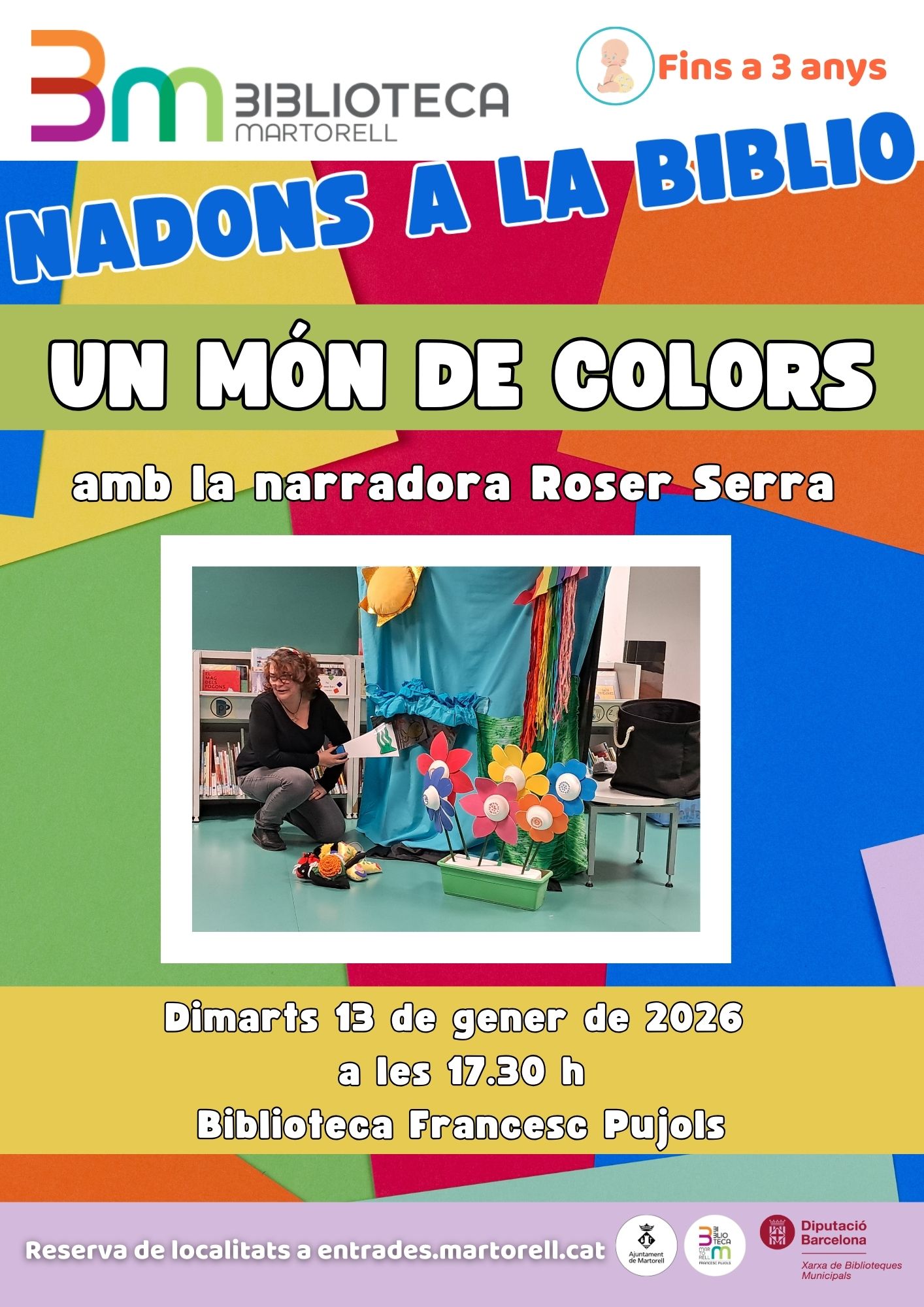 El dimarts 13, la narradora Roser Serra conduirà un nou ‘Nadons a la Biblio’ (17.30h) per a nens i nenes de fins a 3 anys titulat ‘Un món de colors’, un text per fer descobrir que de la foscor neixen els colors més bonics.