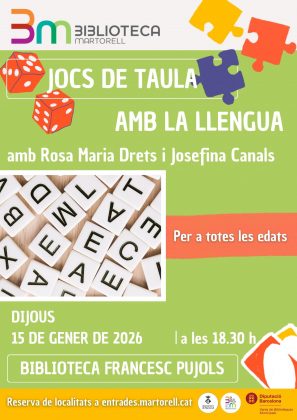 El dijous 15 serà el torn de Rosa Maria Drets i Josefina Canals de posar en pràctica una nova sessió mensual dels Jocs de taula amb la llengua. Una activitat lúdica per a tota la família que treballa les nostres habilitats lingüístiques i aprofundeix en el coneixement de la llengua alhora que fa compartir una estona de joc en grup. La sessió començarà a les 18.30h.