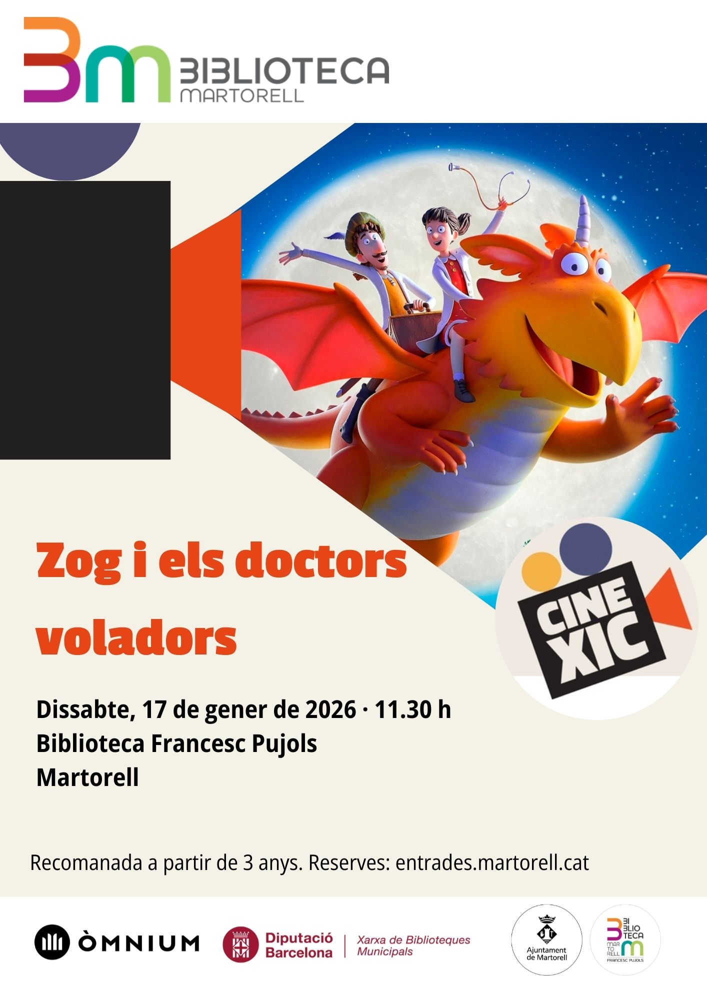 La Biblioteca i Òmnium Cultural organitzen de manera conjunta el ‘CineXic’, activitat mensual de cinema en català per a infants que el proper dissabte 17 de gener (11.30h) emetrà el film Zog i els doctors voladors, on la princesa Perla Llessamí, el cavaller Jordi Rodalmon i el drac Zog formen un equip de doctors decidits a curar tot tipus de criatures, i que toparan amb el rei, oncle de la Perla, que desconfia.