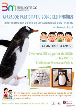 El dia següent, divendres 23 de gener, Maria Toral proposa un aparador participatiu (18.15h) sobre els pingüins, a propòsit del Dia de Conscienciació pels Pingüins, per estimar i protegir aquestes aus en perill d’extinció. Per fer l’aparador, es recomana als infants a partir de 4 anys i a les seves famílies portar oueres de cartró (de 6 ous) i tubs de cartró del rotlle de paper higiènic o paper de cuina.