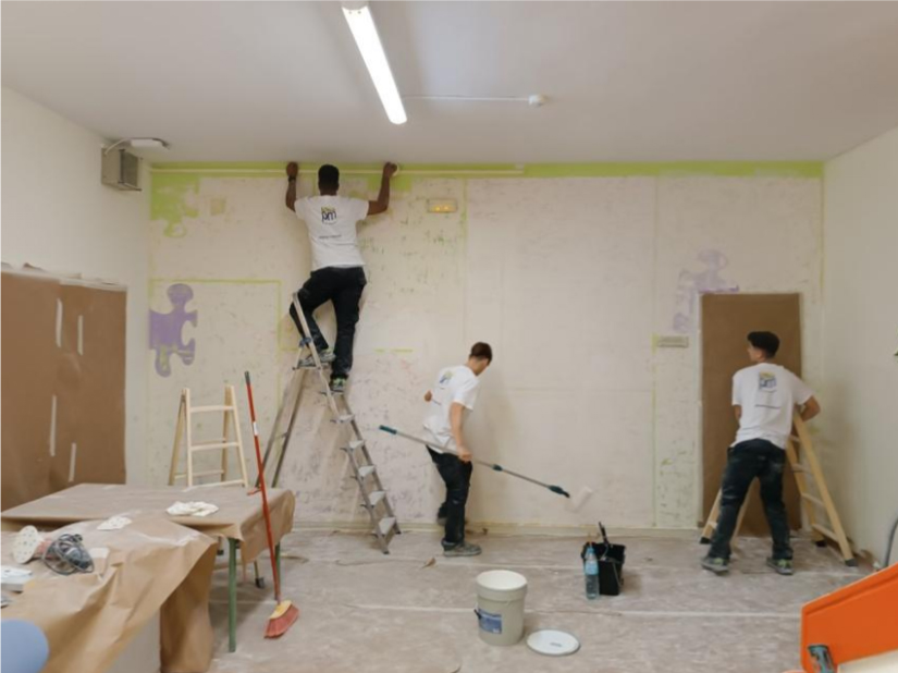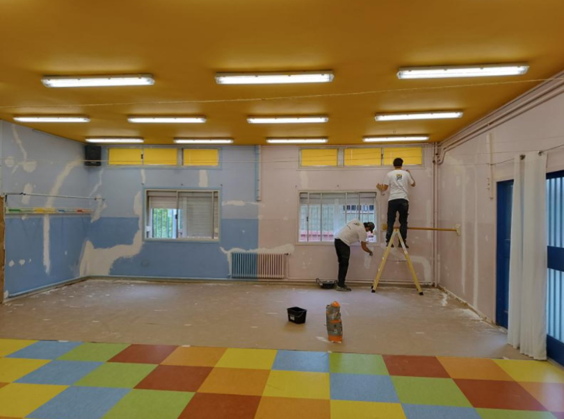 Escola José Echegaray: tasques de pintura traient l’estucat de la paret del vestíbul, neteja de les parets, arranjament dels desperfectes, dues mans de pintura, neteja i recol·locació del mobiliari al seu lloc.
