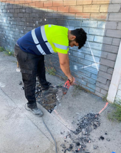 Exterior de la Comissaria de la Policia Local: actuació de paleteria per fer una rasa al costat de l’edifici de la Comissaria de la Policia Local per trobar i buidar una fuita d’aigua, fer els preparatius per a la reparació de la canonada d’aigua per part del lampista i tapar i fer els acabats a la rasa un cop reparada.