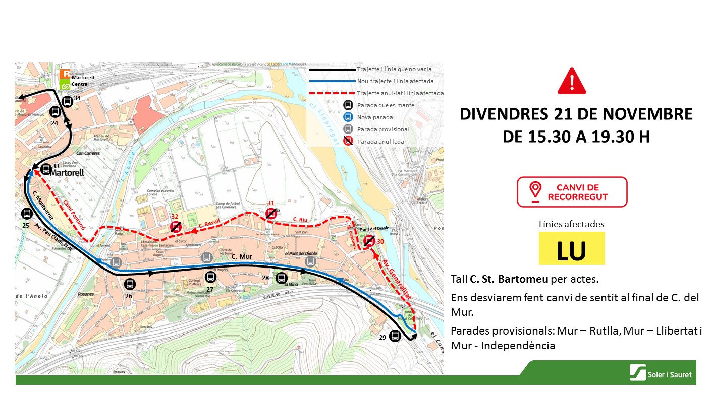 D’altra banda, es modifica el recorregut habitual de la línia de bus LU de Soler i Sauret en motiu de la celebració de l’acte d’encesa de les llums de Nadal al pont del Diable i a Les Bòbiles.