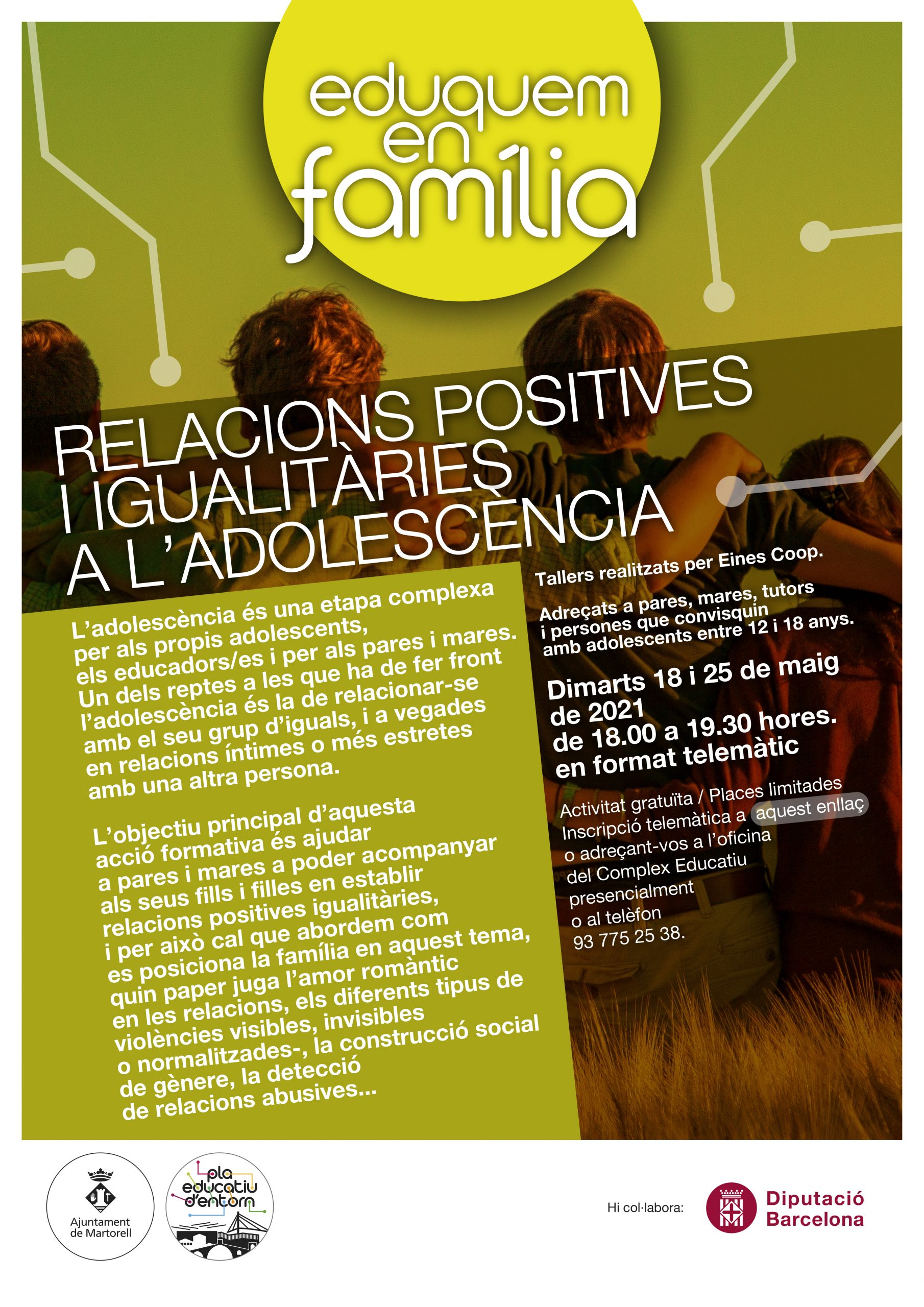 La primera serà ‘Relacions positives i igualitàries a l’adolescència’ a càrrec d’Eines Coop. i adreçats a pares, mares, tutors i persones que convisquin amb adolescents entre 12 i 18 anys. Tindrà lloc el 18 i 25 de maig, de 18.00 a 19.30h, en format telemàtic.