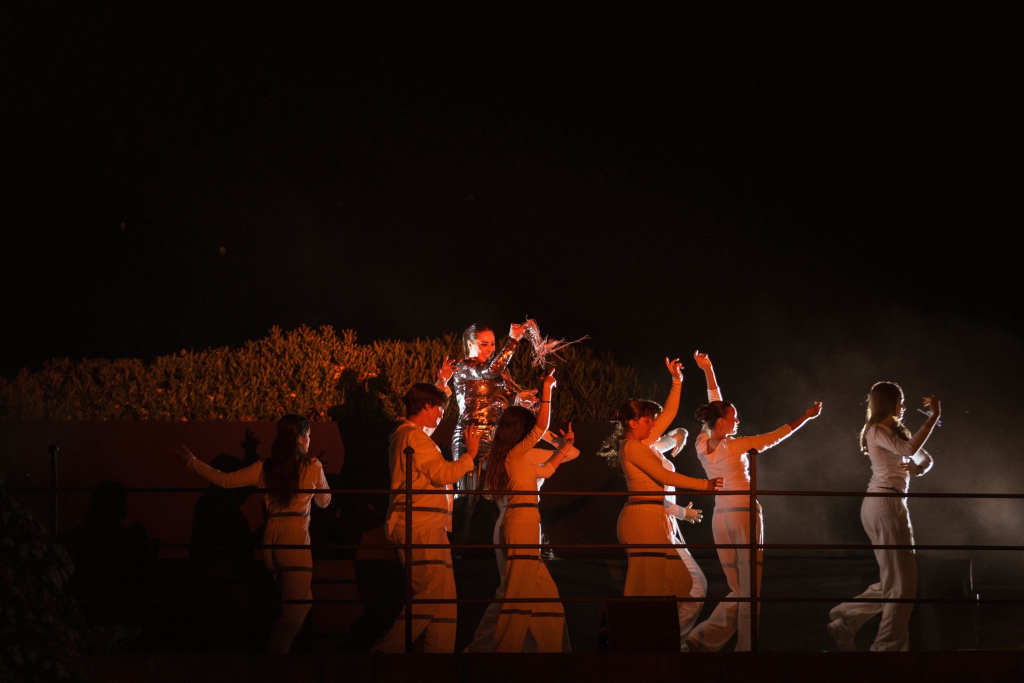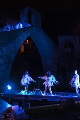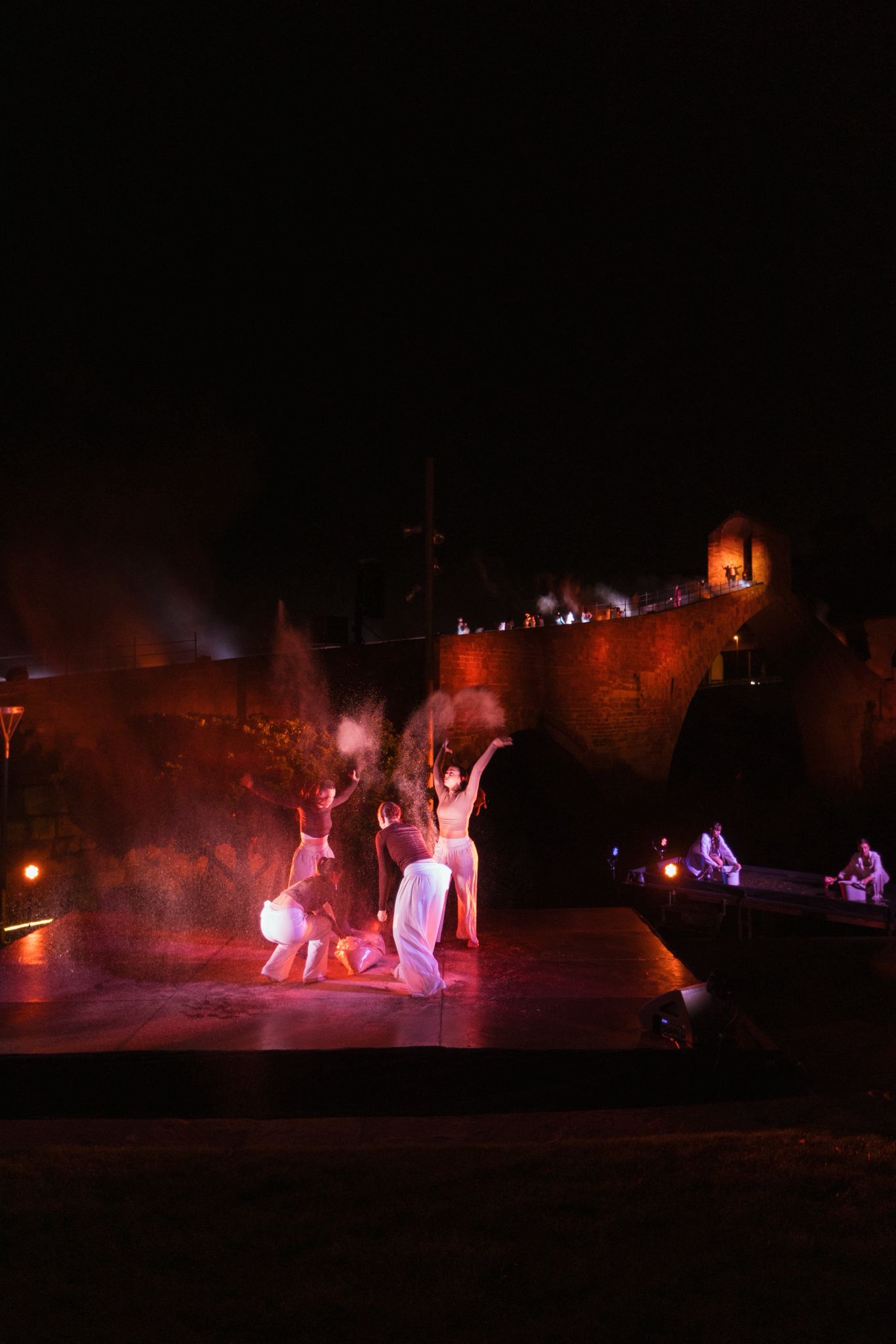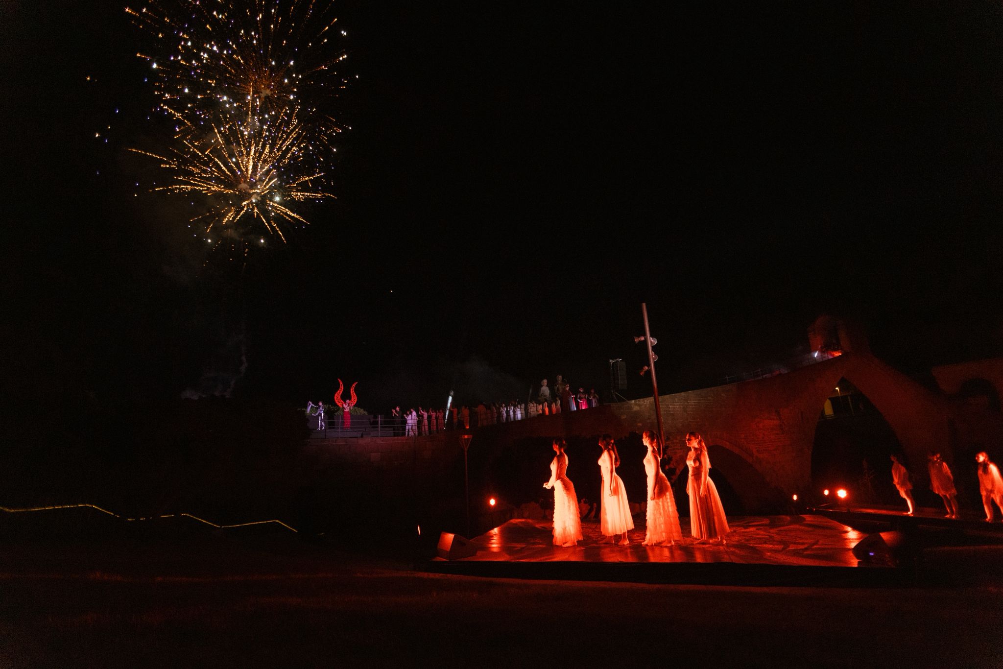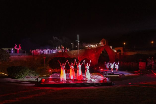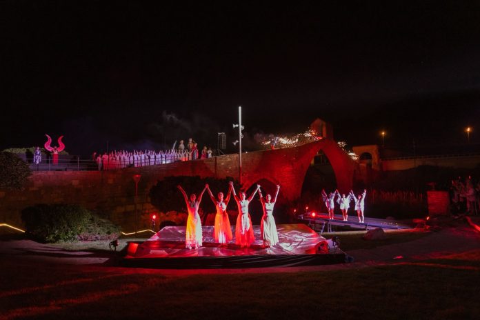 El públic ha pogut viure una reinterpretació innovadora de la llegenda a través d’un ball passional i cants originals en diàleg amb l’arquitectura del pont. Els creadors del muntatge han donat molta potència a la figura de la velleta, que no es rendeix mai i que representa la força col·lectiva del poble i de la saviesa popular. El gat ha interpel·lat amb la natura i l’ecologia i el diable, amenaçador com sempre, es converteix en promotor de la superació.