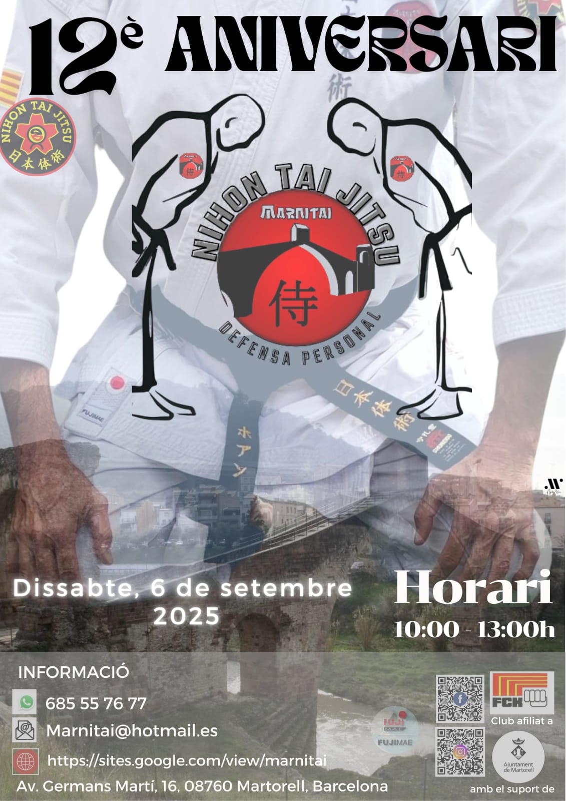 L’Associació Esportiva Nihon Tai Jitsu de Martorell commemora enguany el seu 12è aniversari i ho farà amb una trobada molt especial el pròxim dissabte 6 de setembre. L’entitat, dedicada a la pràctica i difusió del Nihon-tai-jitsu, ha consolidat en aquests anys una trajectòria marcada per la formació, la disciplina i la promoció d’aquest art marcial al municipi.