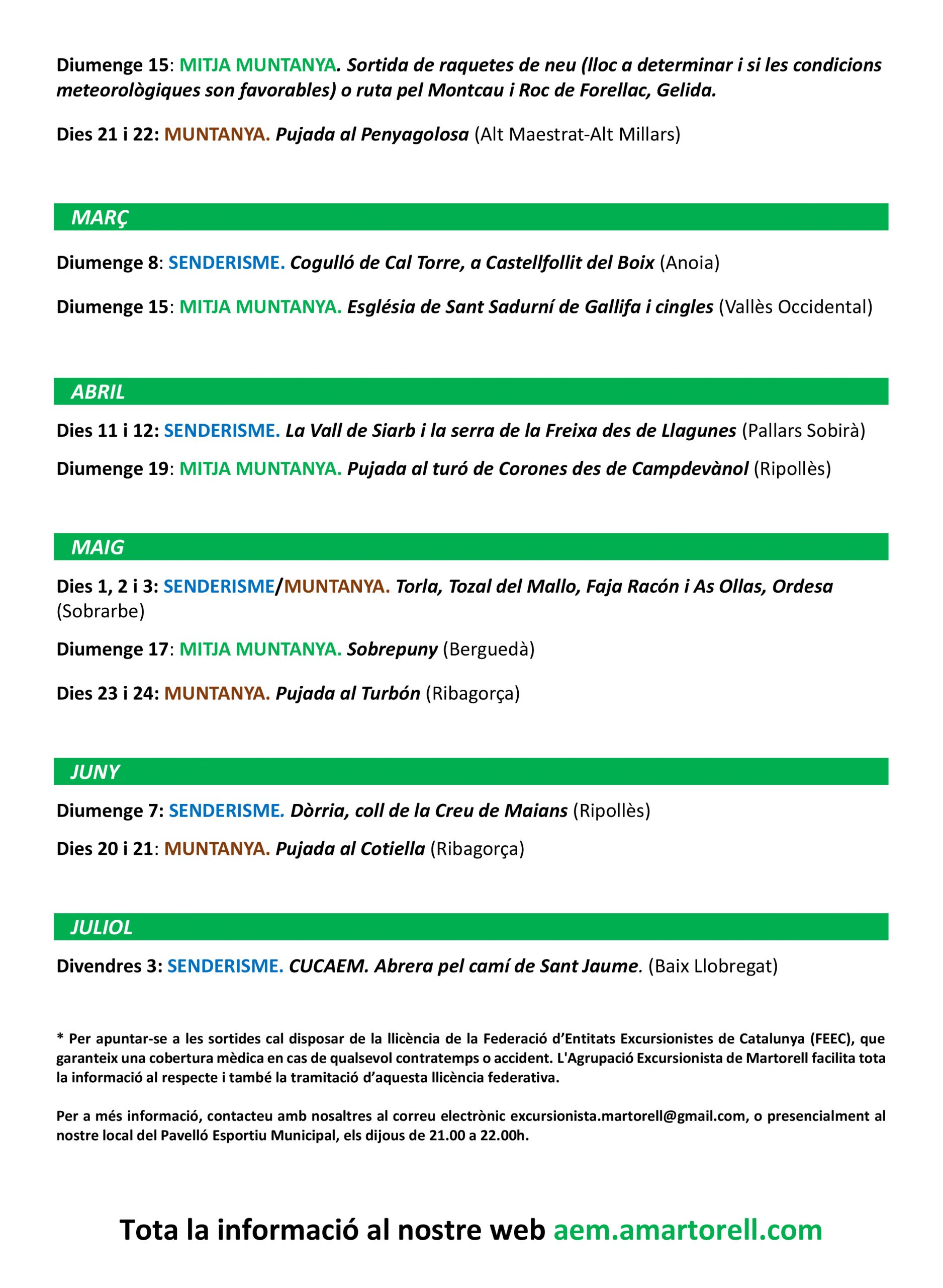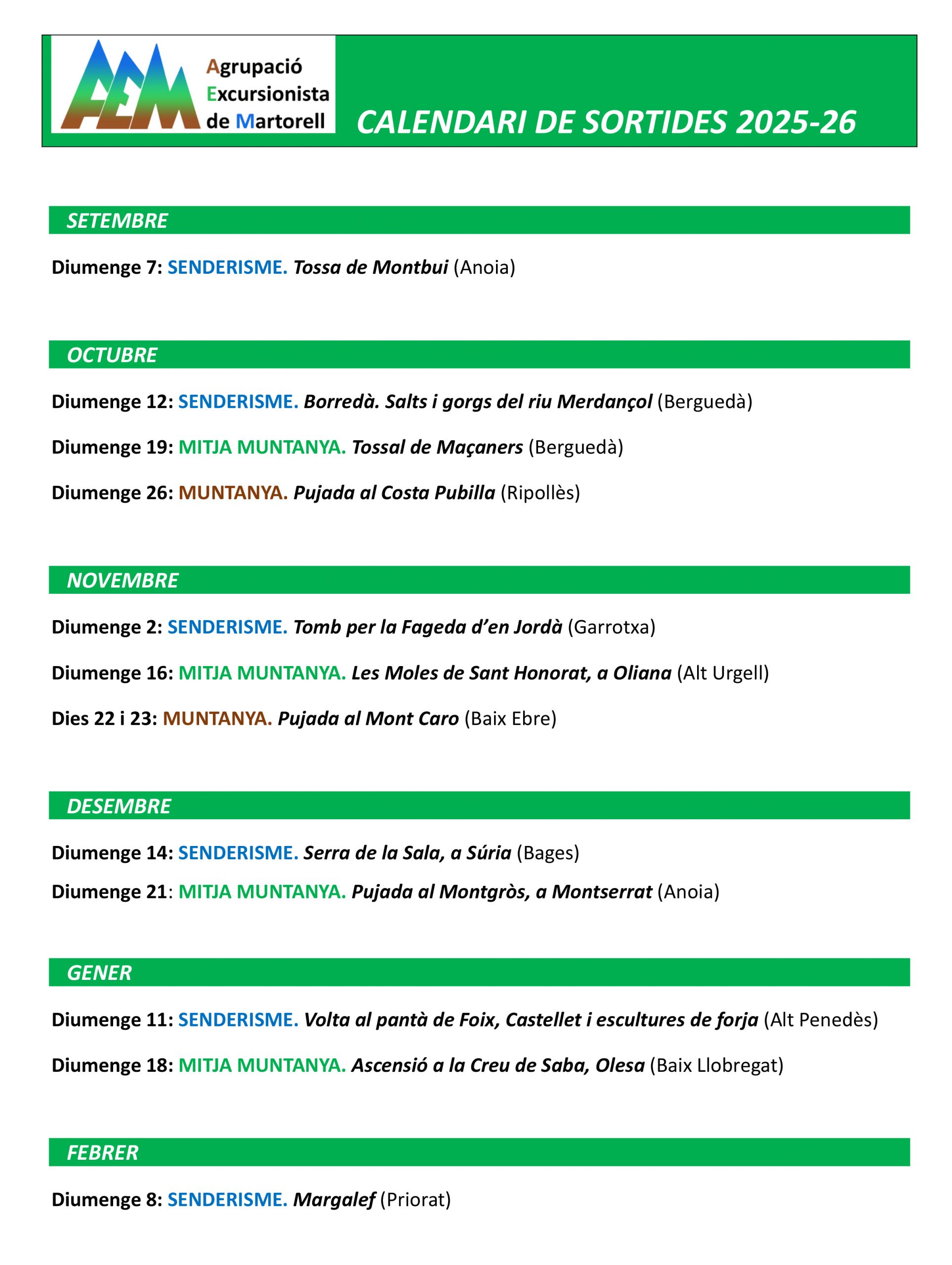 Calendari de sortides AEM. Temporada 2025-26