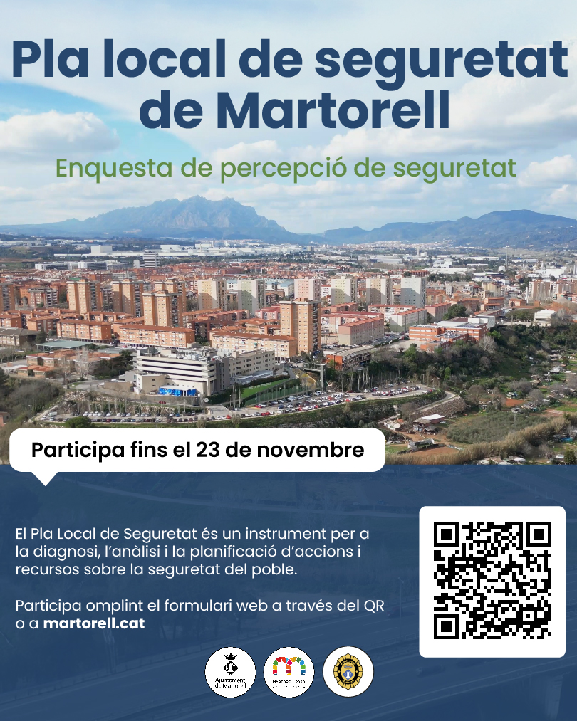 L’Ajuntament de Martorell ha activat aquest dimarts una enquesta ciutadana sobre seguretat que romandrà oberta fins al 23 de novembre. D’aquesta manera es vol recollir l’opinió i les experiències del veïnat per tal que el nou Pla Local de Seguretat sigui un document transversal, participatiu i ajustat a la realitat del municipi.
