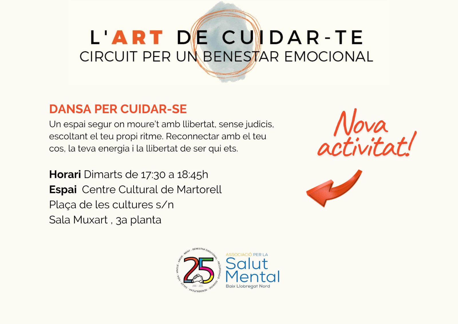 Aquest taller forma part del projecte ‘L’art de cuidar-te’, on “l’art i el moviment ens ajuden a reconnectar amb nosaltres i amb els altres, a cuidar la nostra salut mental de manera viva i compartida, un lloc de recollida i de respecte, on expressar-nos lliurement”.