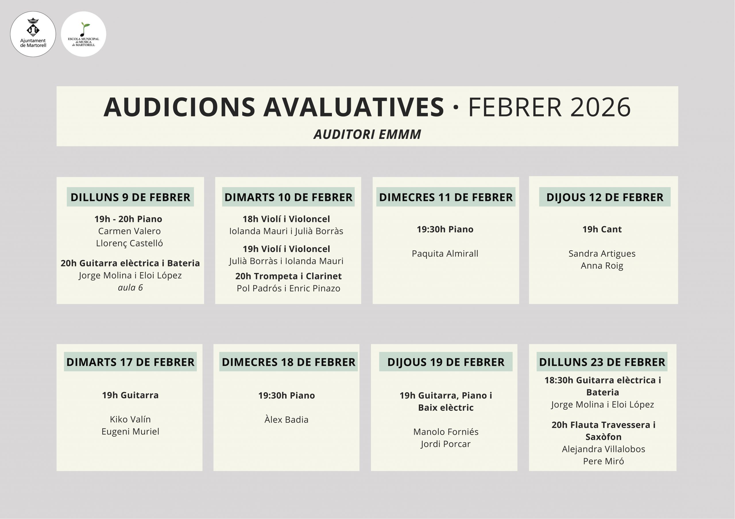 La setmana següent continuaran les audicions avaluatives el dimarts 17 de febrer amb la prova de guitarra (19.00h), dimecres 18 amb la de piano (19.30h), dijous 19 amb la de guitarra, piano i baix elèctric (19.00h), i clouran el dilluns següent, dia 23 de febrer, amb les de guitarra elèctrica i bateria (18.30h) i la de flauta travessera i saxòfon (20.00h).