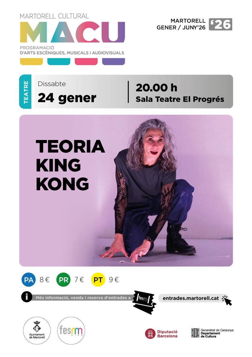 Dissabte 24 de gener, a les 20.00 h, el Teatre El Progrés acollirà l’obra Teoria King Kong, interpretada per l’actriu Maria Pau Pigem. Es tracta de l’adaptació escènica de l’assaig del feminisme i la teoria de gènere de la cineasta i novel·lista Virginie Despentes. Hi aborda, des de l’experiència personal, qüestions com la violència, el desig, la moral i el patriarcat.