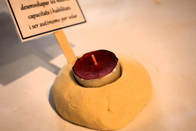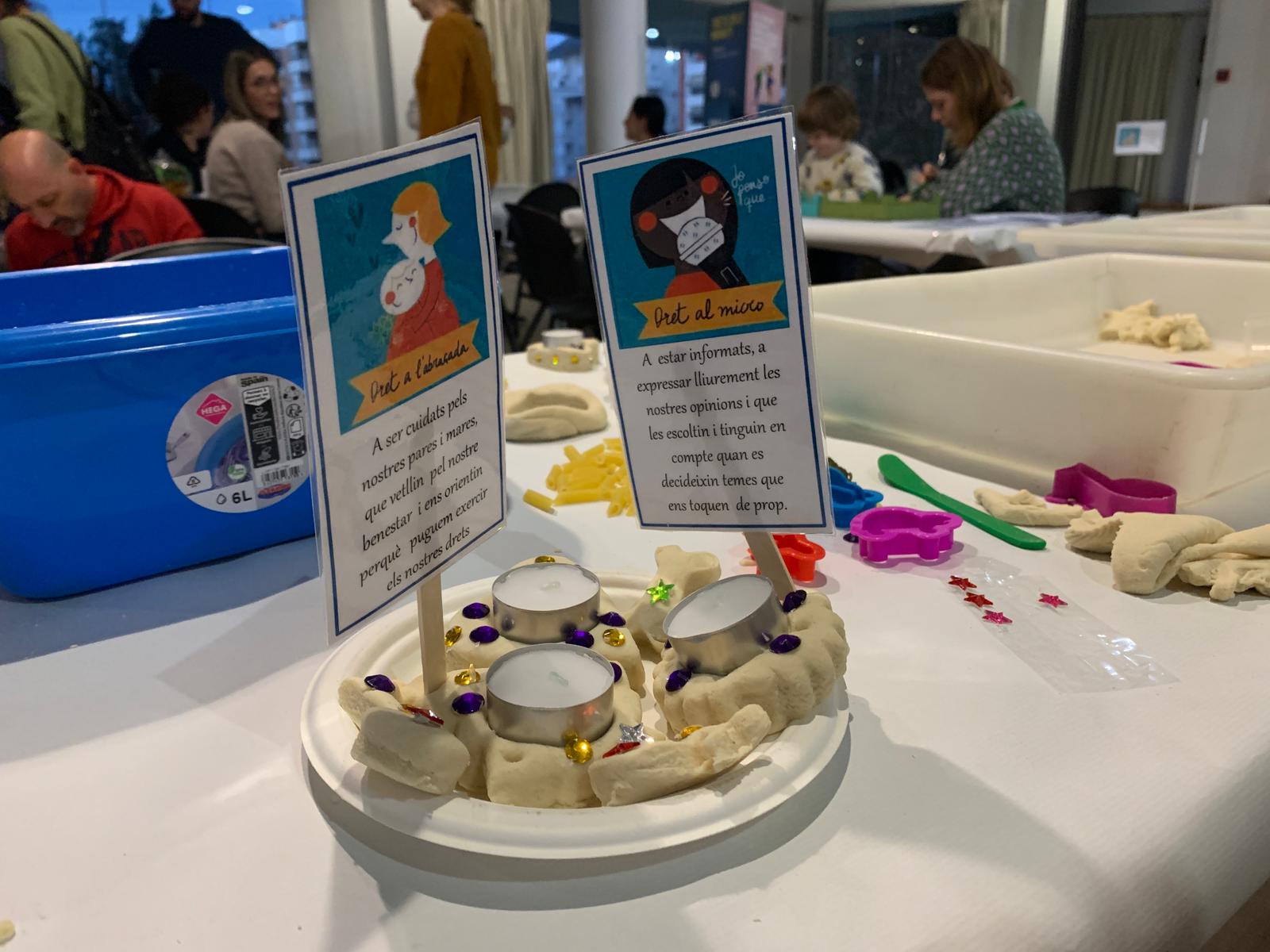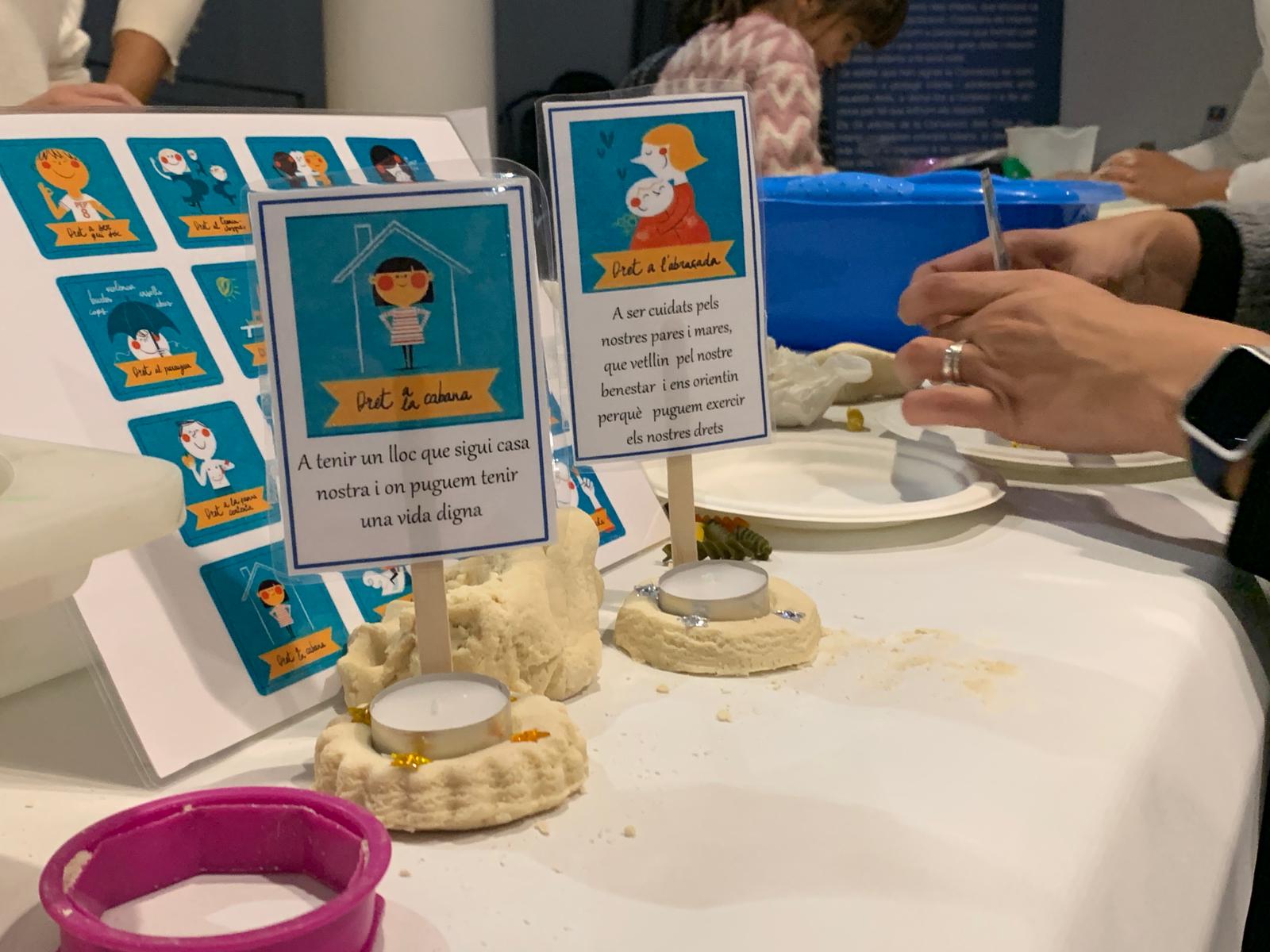 El taller ha proposat la creació d’una espelma feta amb pasta de sal. Els infants han elaborat la seva pròpia pasta, han modelat diferents formes i han decorat la seva espelma destacant-hi el dret que més els agrada o que els sembla més important.