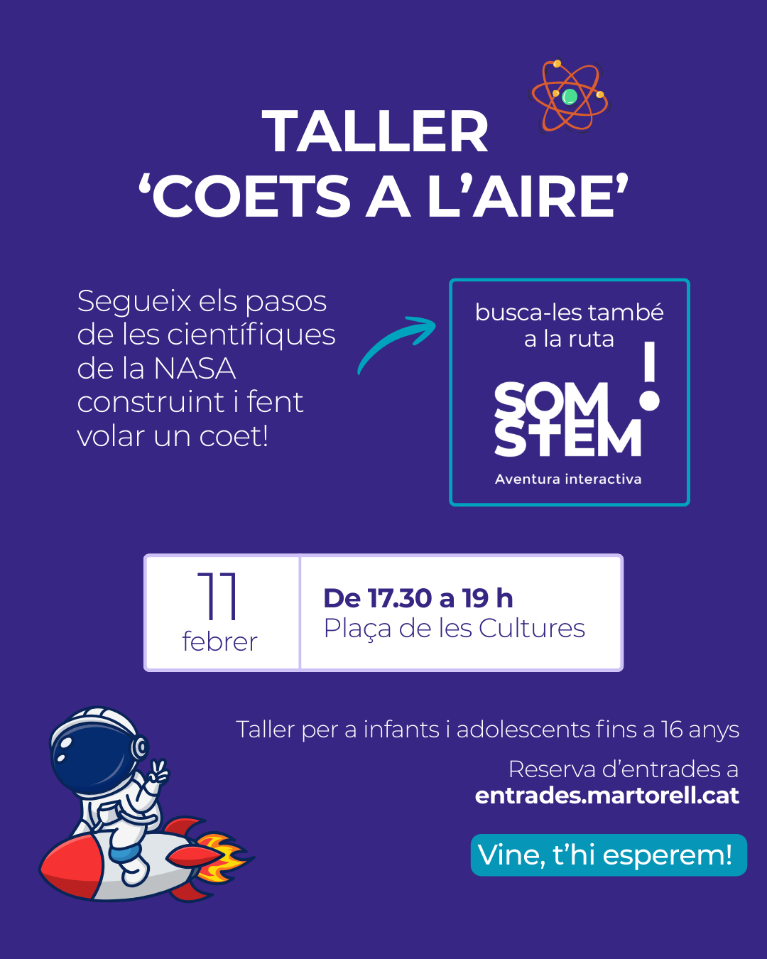 El taller ‘Coets a l’aire’ és gratuït i es realitzarà el dimecres, 11 de febrer, a la plaça de les Cultures, de 17.30h a 19.00h. Ja podeu reservar les vostres entrades per al taller a través del portal entrades.martorell.cat.