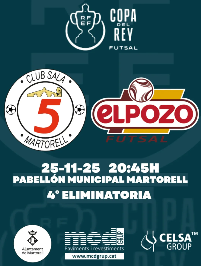 El primer equip del Sala 5 Martorell afronta aquest dimarts 25 de novembre un dels partits més especials de la temporada. Els martorellencs disputaran els 16ns de final de la Copa del Rei contra ElPozo Murcia, un històric del futbol sala estatal i actual líder de la Primera Divisió. El duel començarà a les 20.45h al Pavelló Esportiu Municipal, que es preveu que presenti una gran entrada.